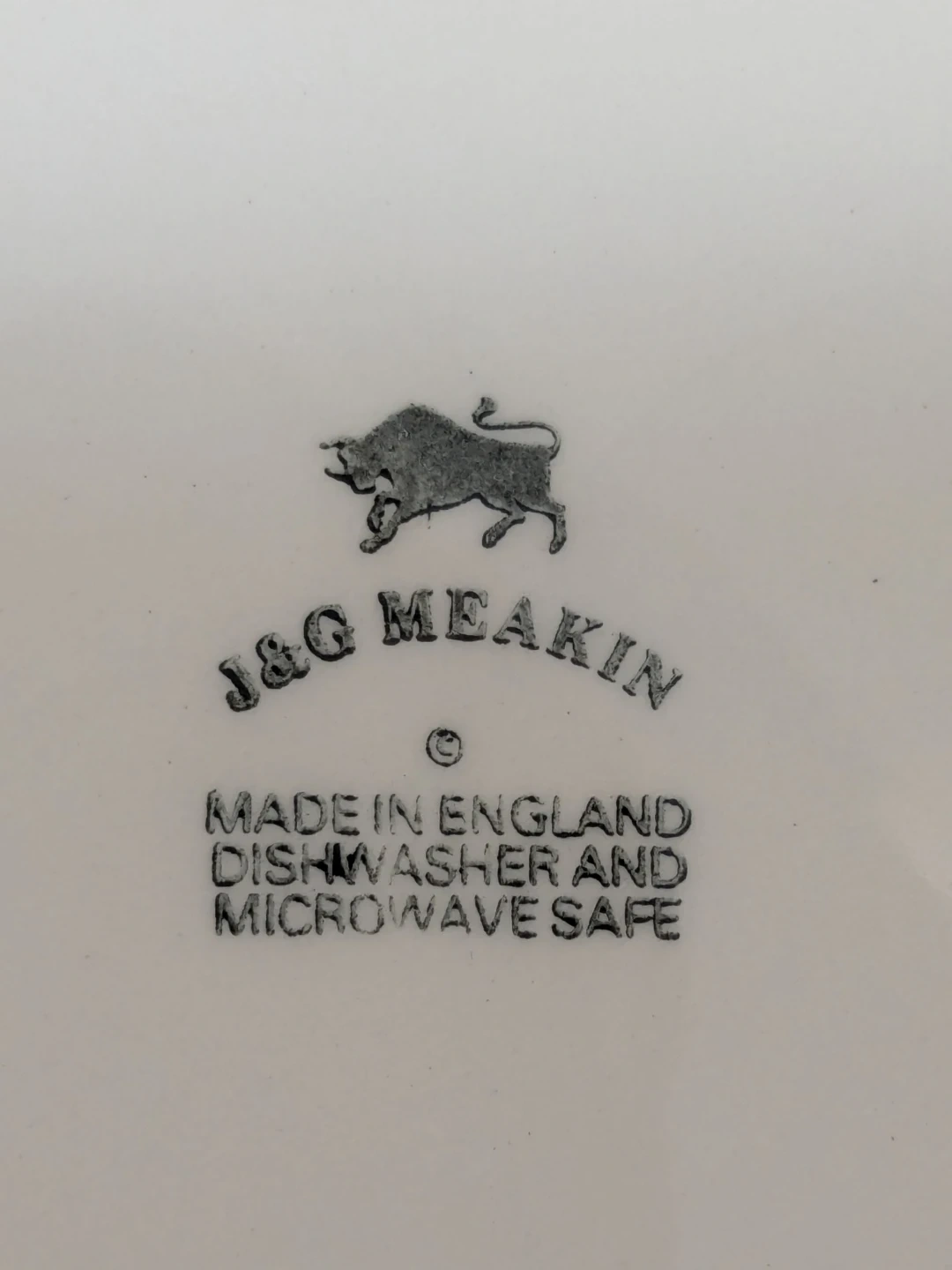A set of 8 J&G Meakin Greemore plates, made in England. These plates are dishwasher and microwave safe. The gold trim adds an elegant touch.