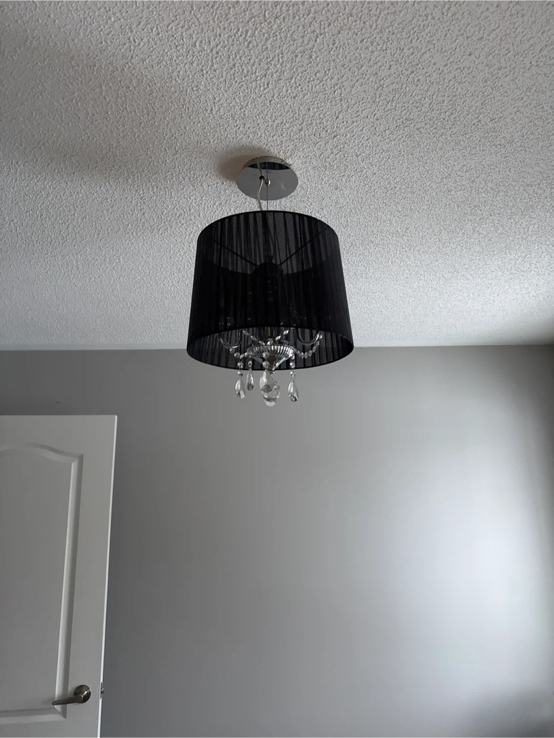 Selling a stylish black chandelier ceiling light! It features a black shade with crystal accents, adding a touch of elegance to any room. Perfect for dining rooms, bedrooms, or entryways