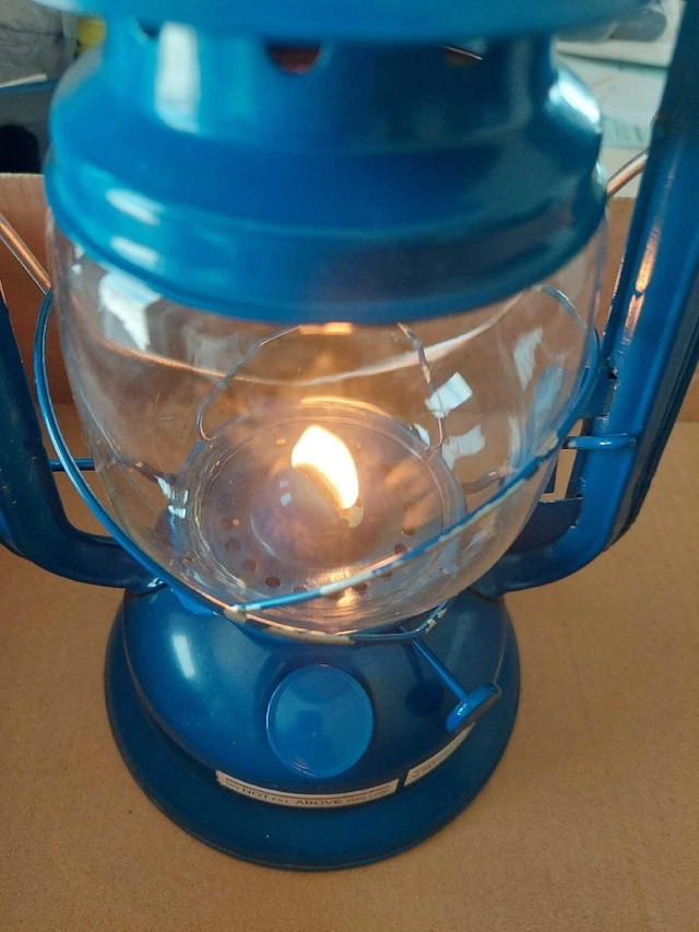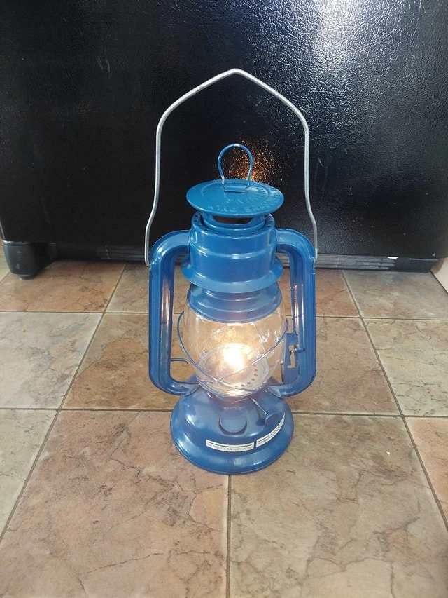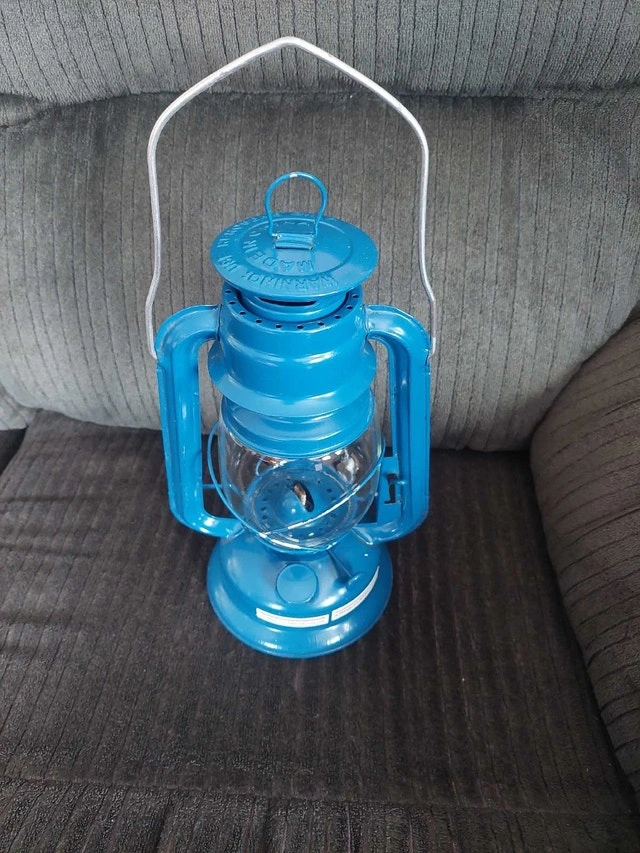Kerosene lamps with a vintage style. These have a metal body with a glass globe chimney. They provide light and heat, making them great for emergency use. I used one for atmosphere at a wedding. I have 8 available, and they are like new. They offer a cozy cabin feel and add charm to any space, suitable for indoor or outdoor use. They're also great for an ice fishing aesthetic. Perfect for events like weddings, wakes, celebrations of life, or power outages. Can be used on a tabletop, carried, or hung. They were about $30 each new. Offered at: 1 for $15 / 4 for $50 / 8 for $80. Pick up near Birds Hill Park, Selkirk, or Lockport.