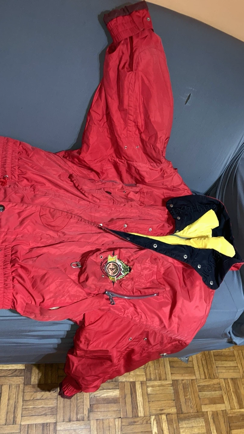 91Cozy Bogner winter jacket, perfect for the Canadian cold! The jacket features a vibrant red exterior with a bright yellow lining and black accents. It's designed for deep snow adventures and has a unique 'B' logo detail. Pickup near Islington and Steeles. Size XL I believe