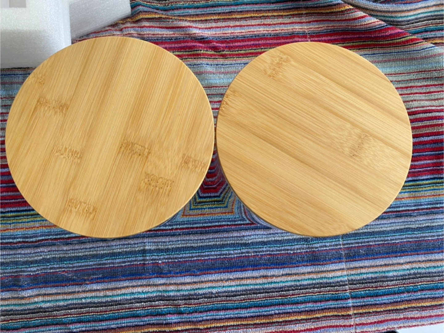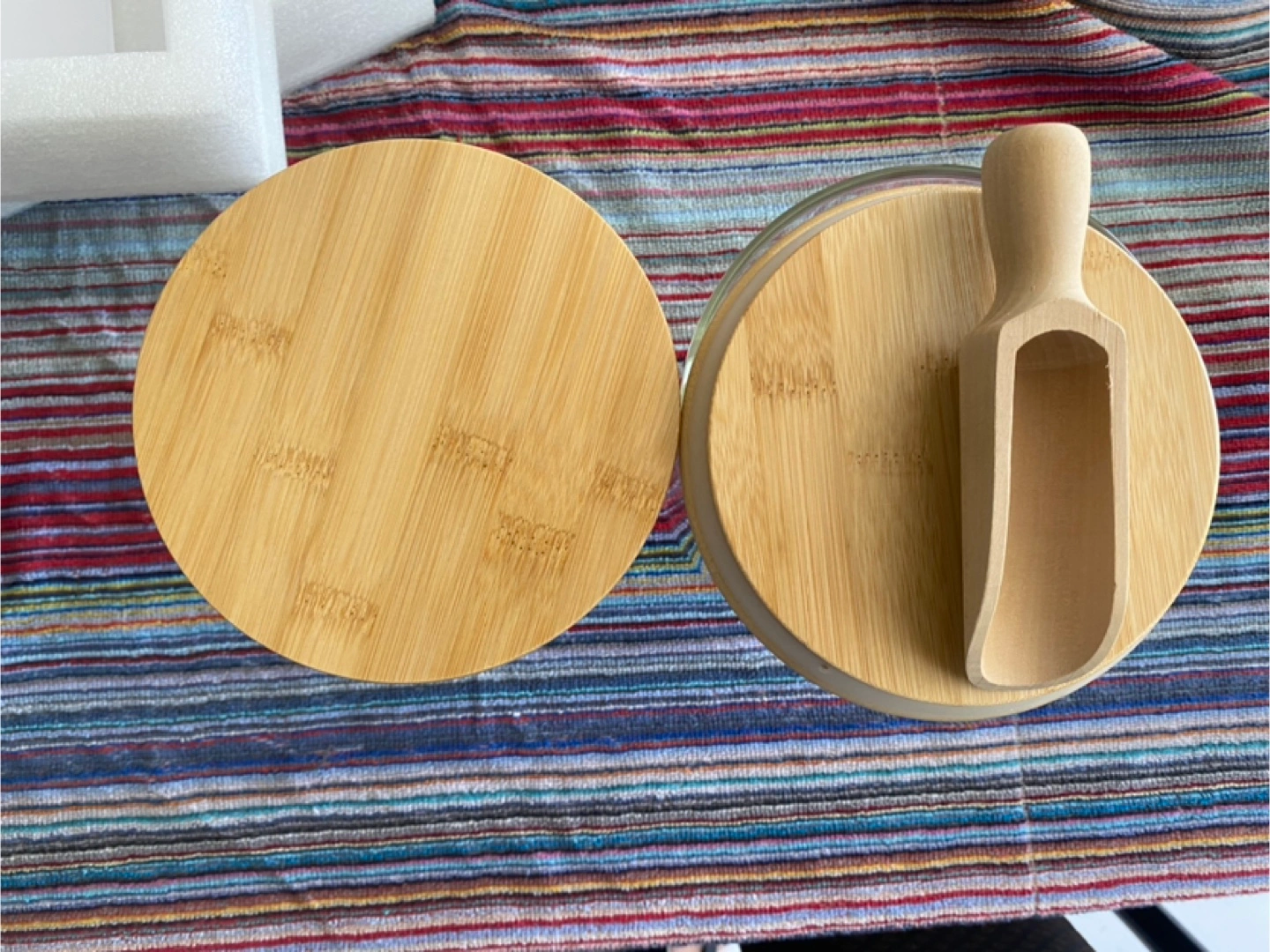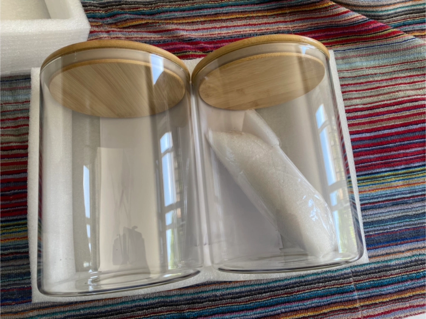 Two large glass canisters. Bamboo lids included. Perfect for storing dry goods or other household items. Set of 2. New, never used.