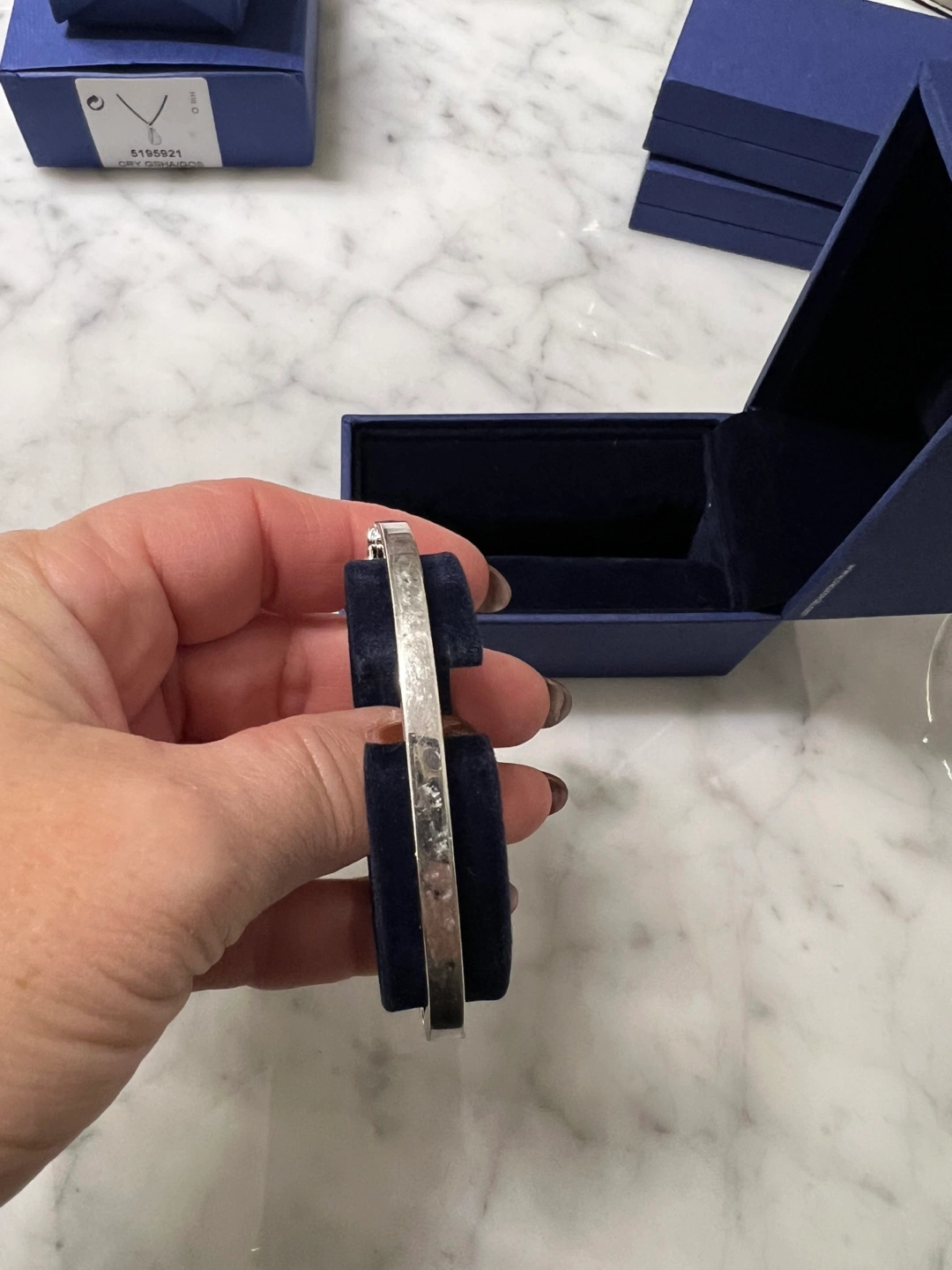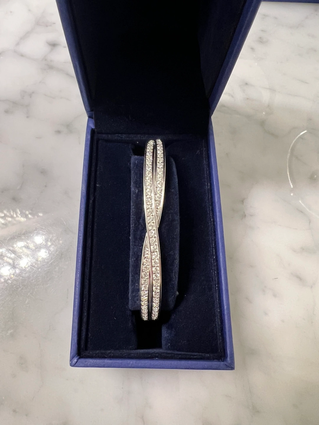 Silver-toned bracelet with clear crystal embellishments. Bangle style with clip closure. Top in excellent condition. Bottom shows some wear. Comes in original box.