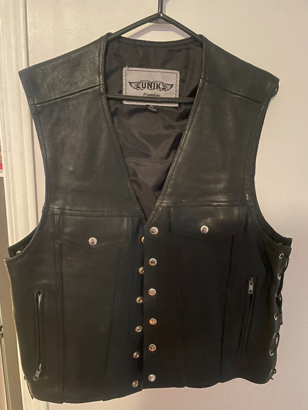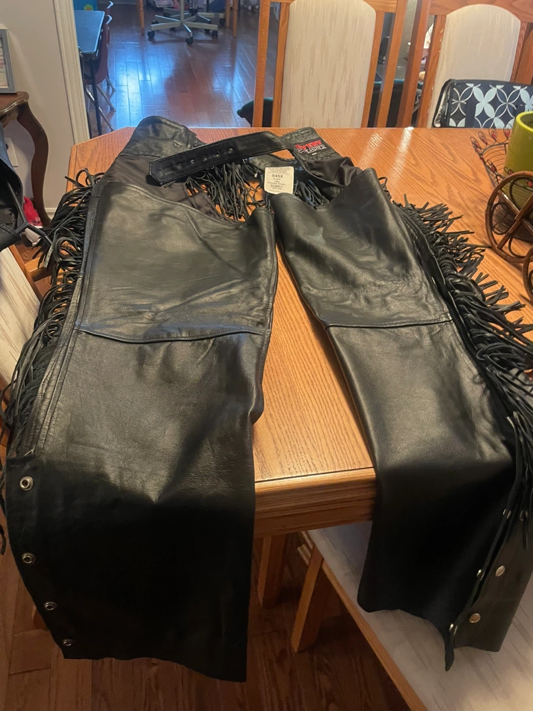 This UNIK Premium leather motorcycle vest and fringed chaps set is made for riding. The vest is size L and the chaps are size 2XL in black. Both pieces are crafted from genuine leather.