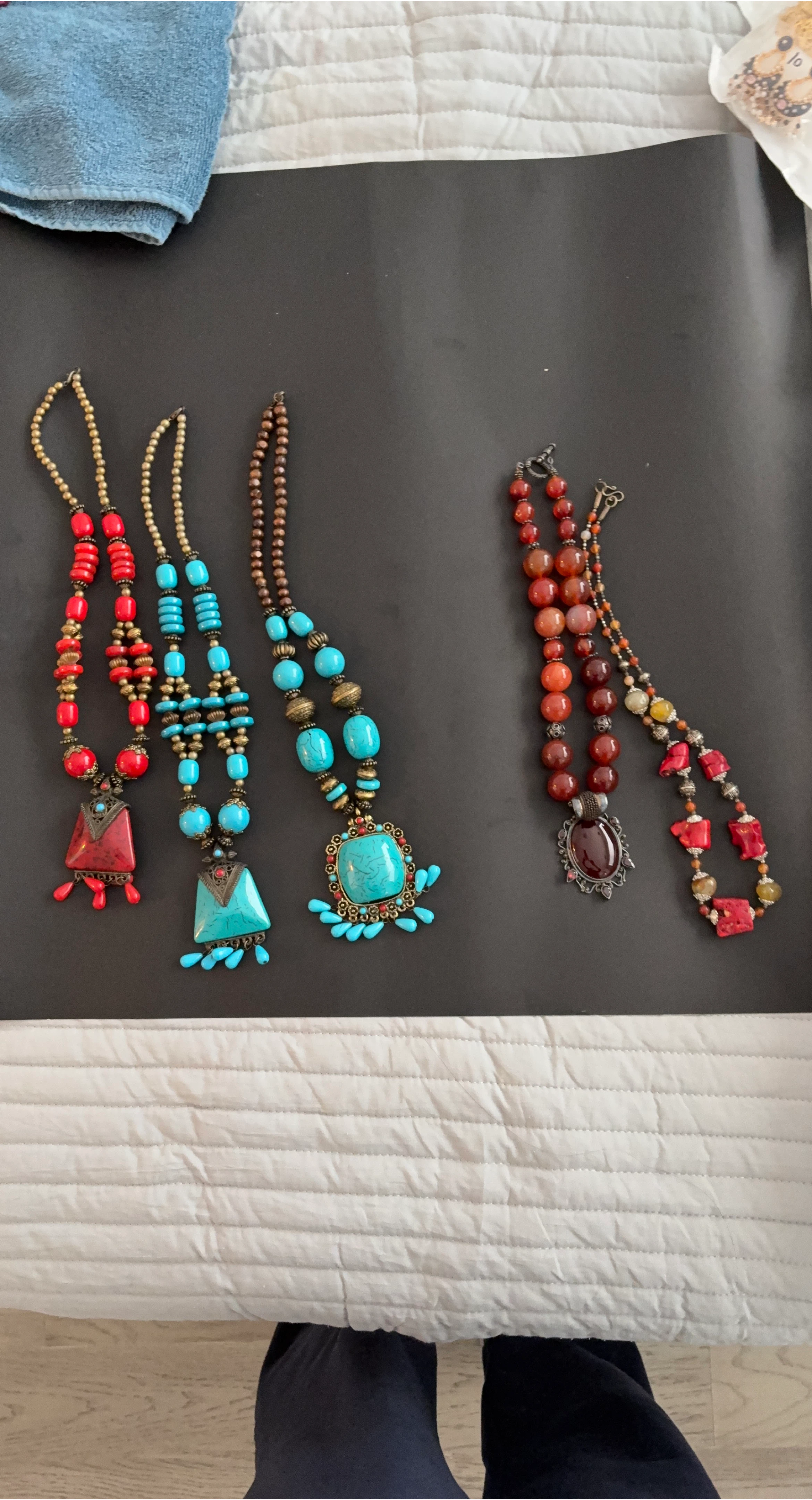 Selling a collection of bohemian-style beaded necklaces! There are four necklaces in total, featuring vibrant red and turquoise beads with unique pendants. Perfect for adding a pop of colour to your outfit!
