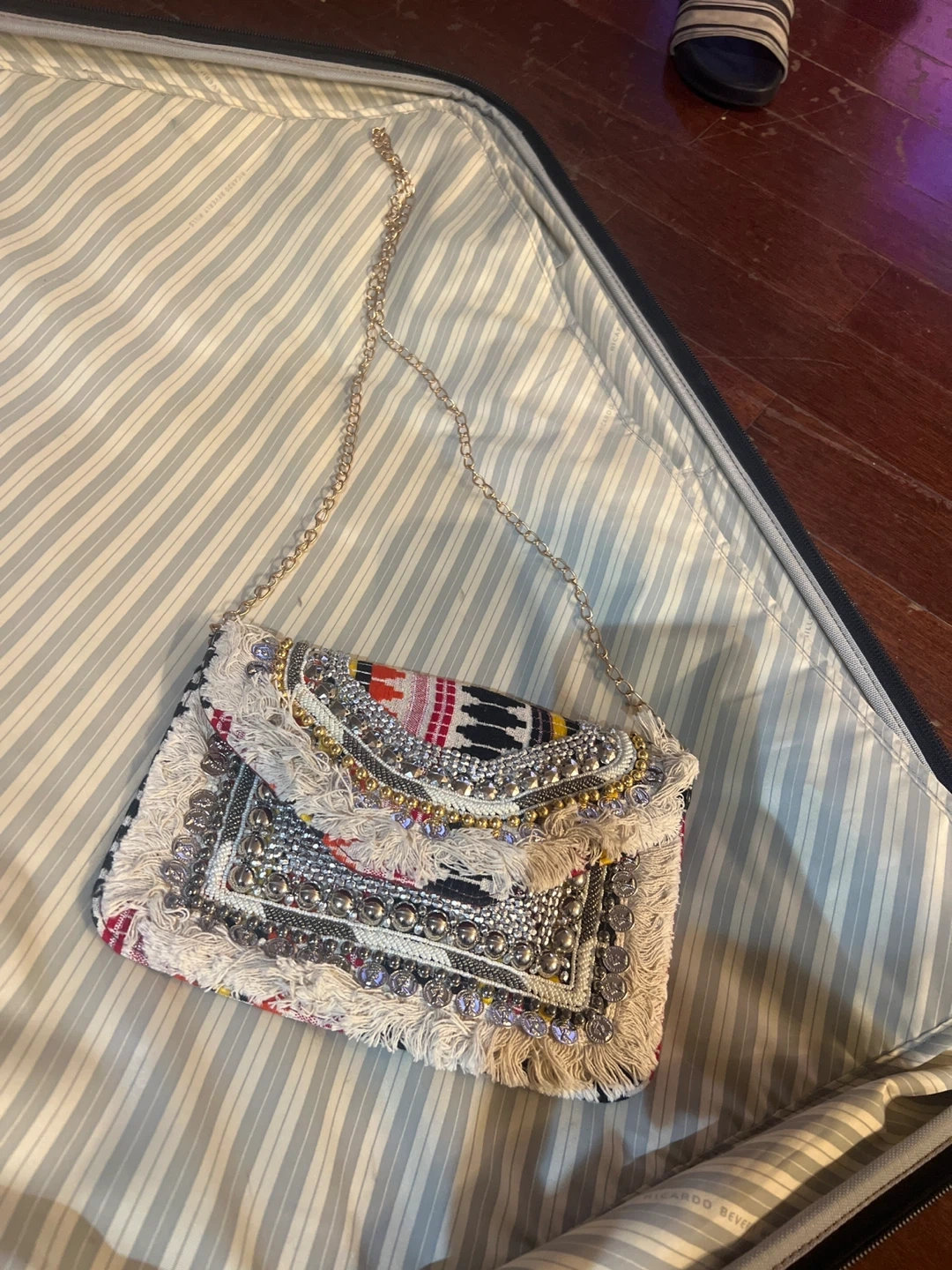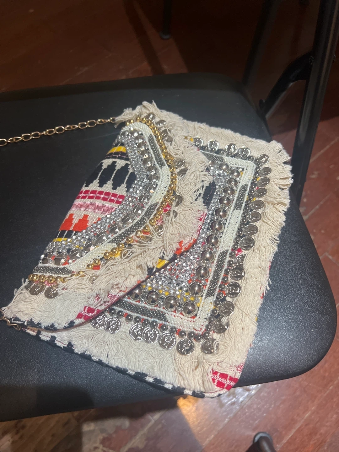 Check out this unique boho-style clutch! It has a chain strap and lots of fun details. Perfect for adding a bit of flair to any outfit