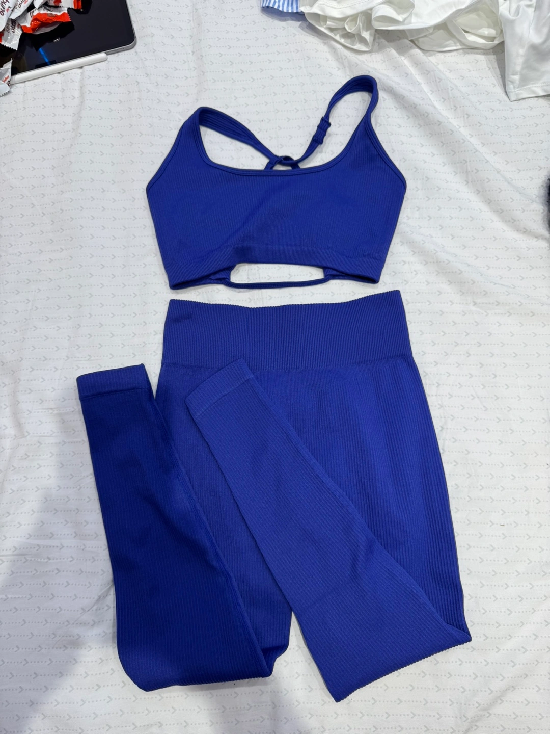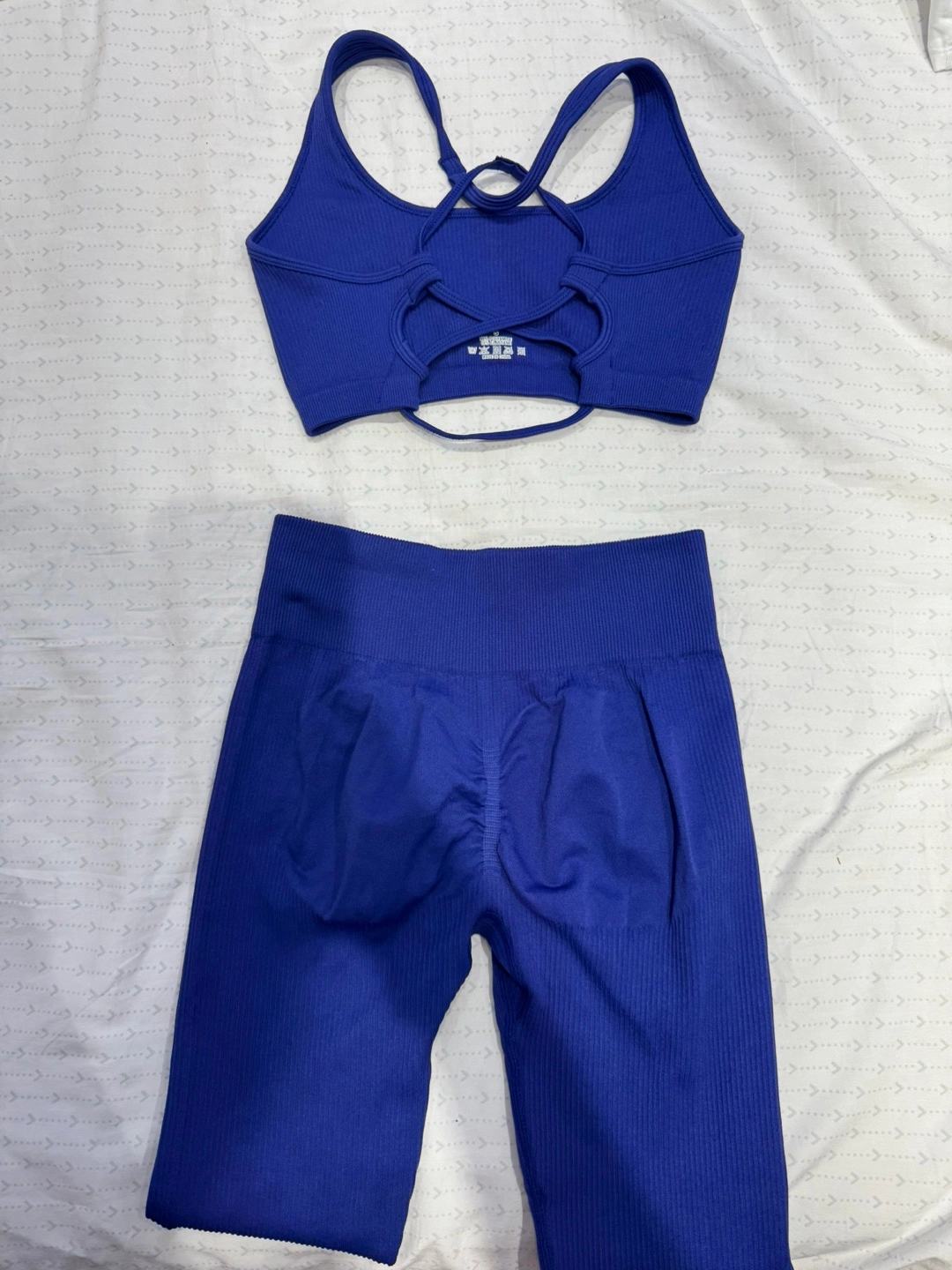 34Beautiful cobalt blue ribbed seamless workout set. Includes sports bra and leggings. Perfect for your next workout.