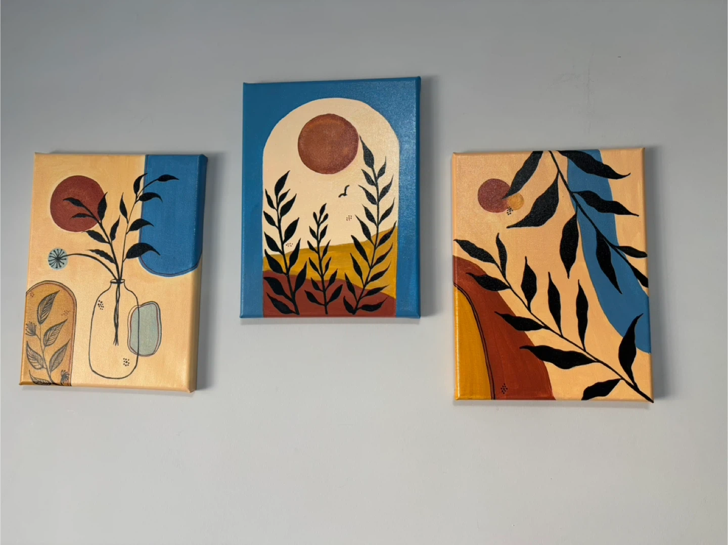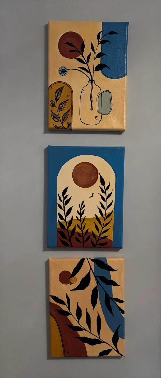 15Selling a set of three canvas paintings in a boho style. They're perfect for adding a touch of warmth and nature to any room. The paintings feature botanical and abstract designs with earthy tones and pops of blue. They are in great condition and ready to be hung up! Medium- Acrylic on canvas Size- 9” by 12” inches Single piece $65 3piece $175 Dm me for more information. Pick up only.