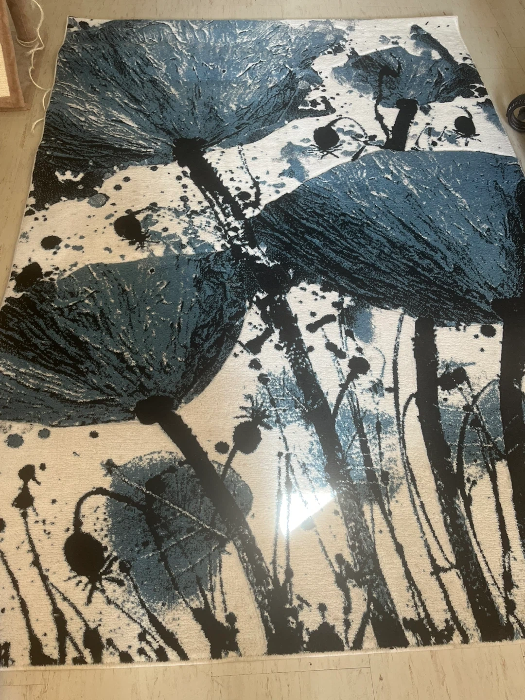 This area rug features a striking abstract floral design in shades of blue, black, and white. It's a great way to add a modern artistic touch to your living space. The rug's material is soft and durable.