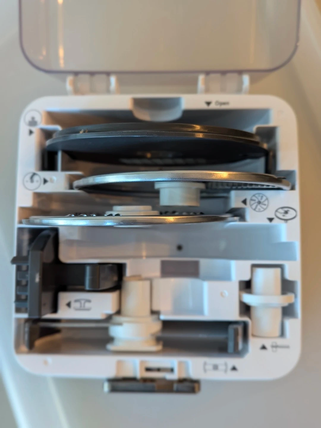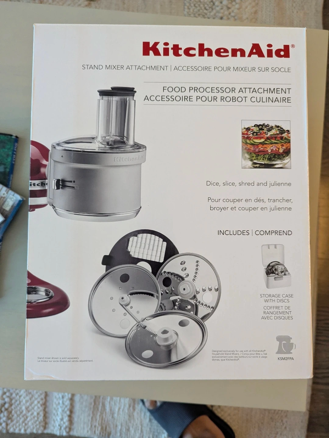 This KitchenAid food processor attachment is designed for dice, slice, and julienne tasks. It includes multiple discs for various preparations and a storage case for the accessories. It's compatible with standard KitchenAid stand mixers.