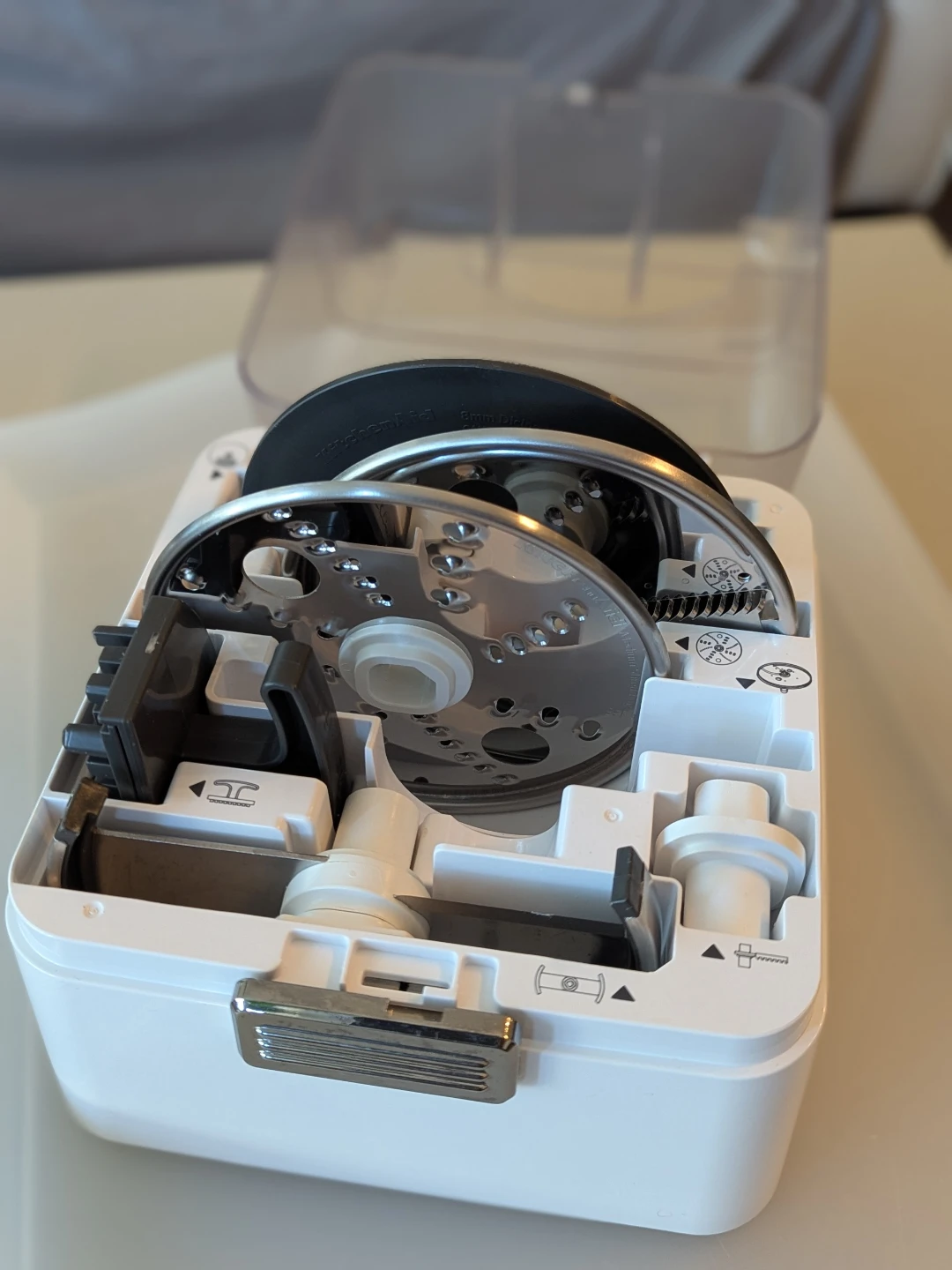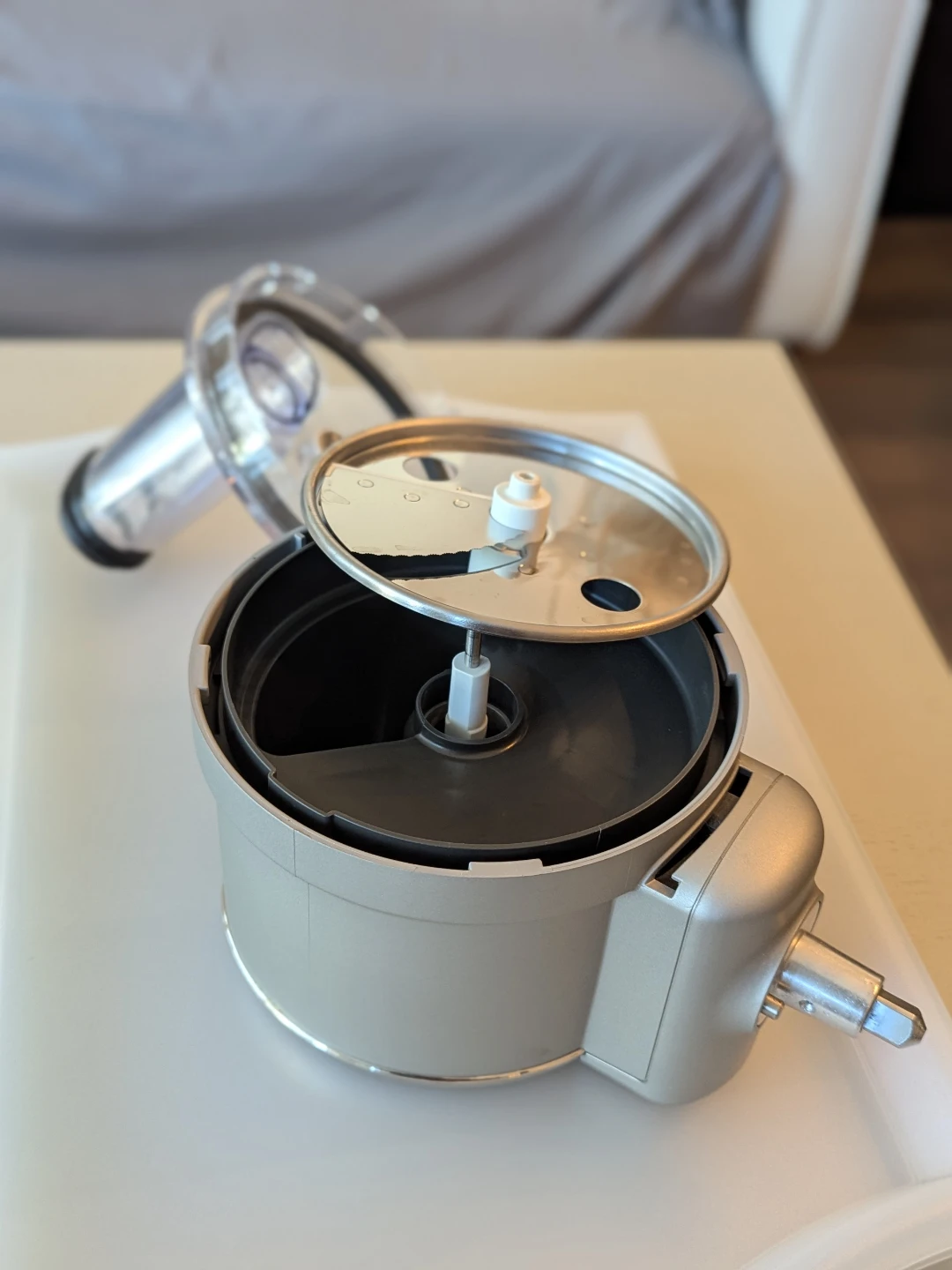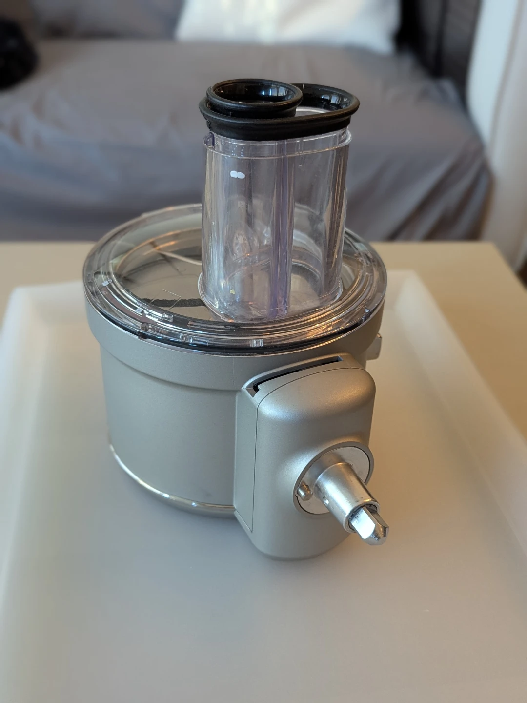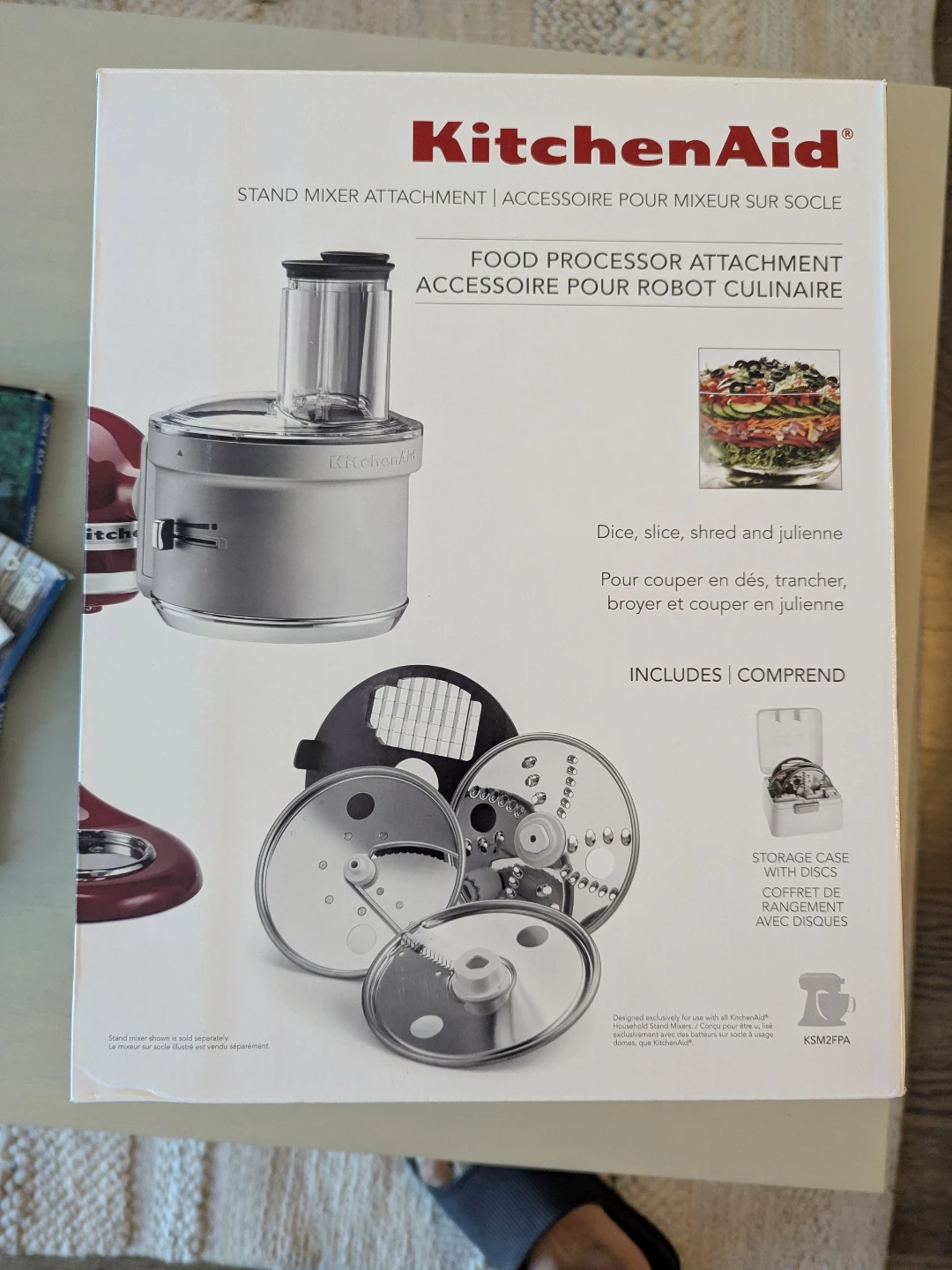 This KitchenAid food processor attachment is designed for dice, slice, and julienne tasks. It includes multiple discs for various preparations and a storage case for the accessories. It's compatible with standard KitchenAid stand mixers.