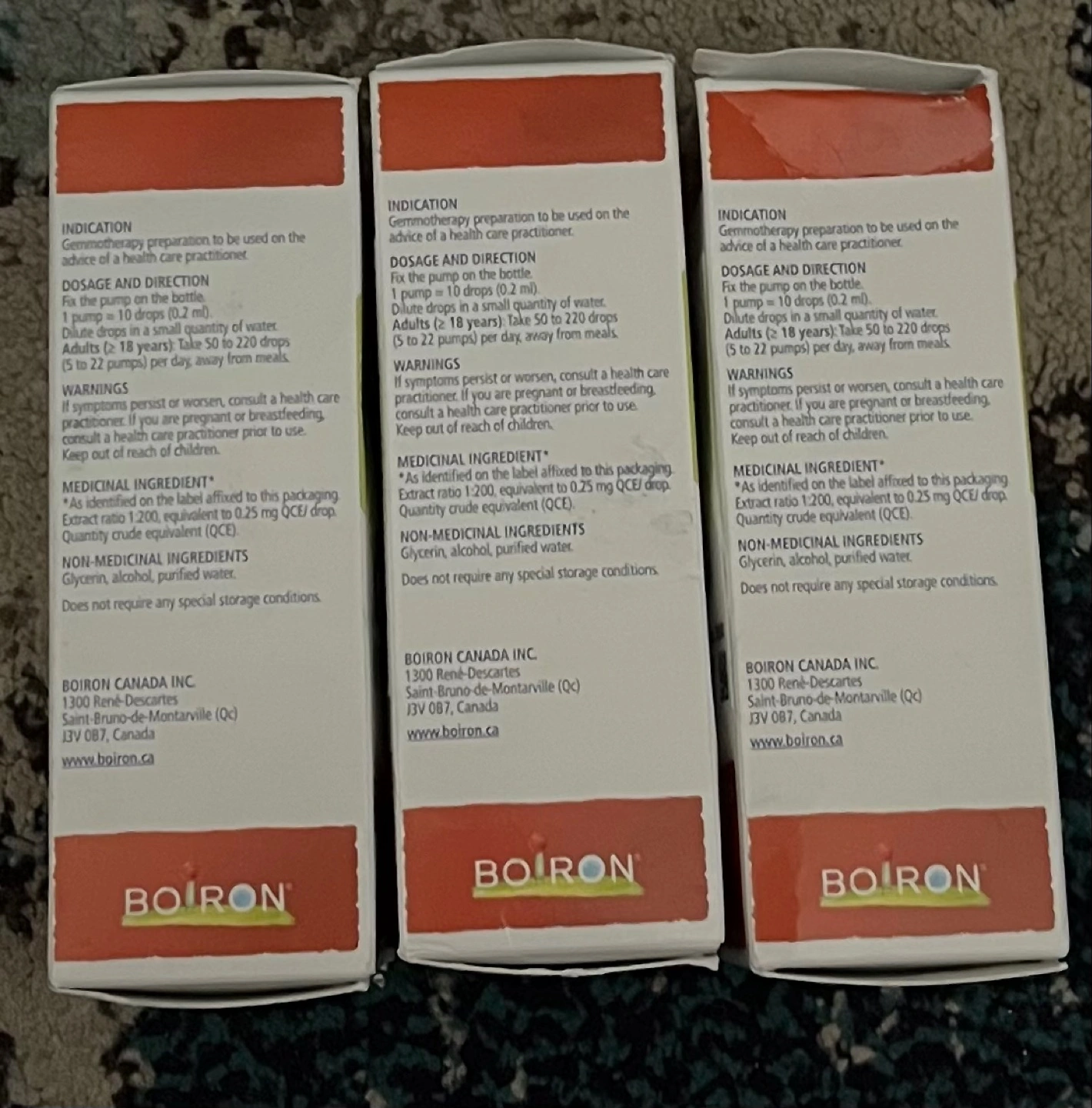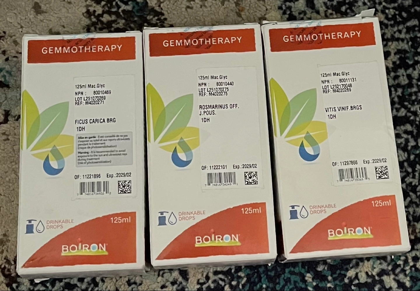 461Three 125ml bottles of Boiron Gemmotherapy drinkable drops. Various types included. Expiry dates visible on packaging. $10 each