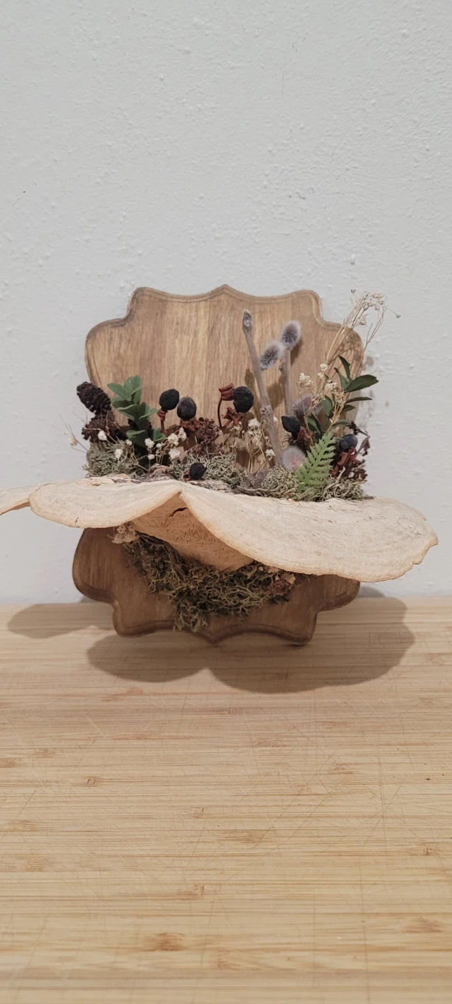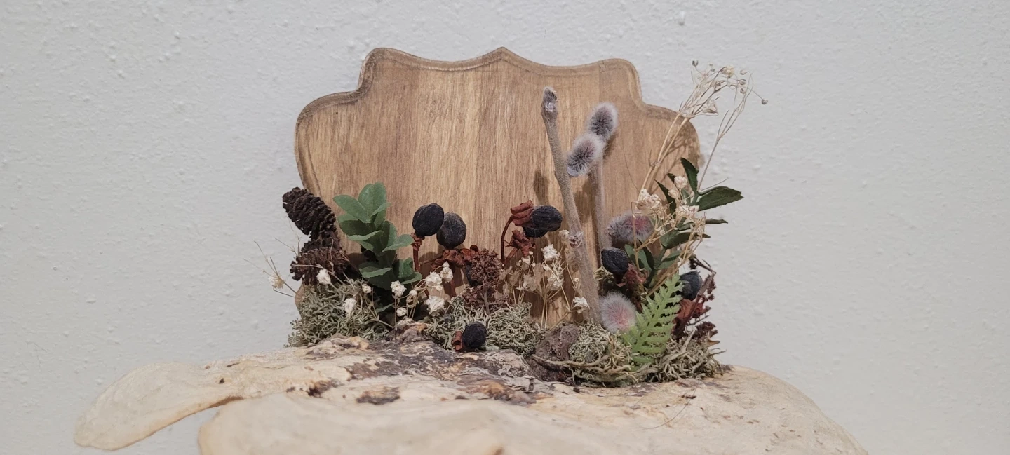 Rustic display featuring preserved natural elements like dried flowers, pinecones, and berries on a wooden base. It has a unique, natural aesthetic. This piece adds a touch of woodland charm to any space.