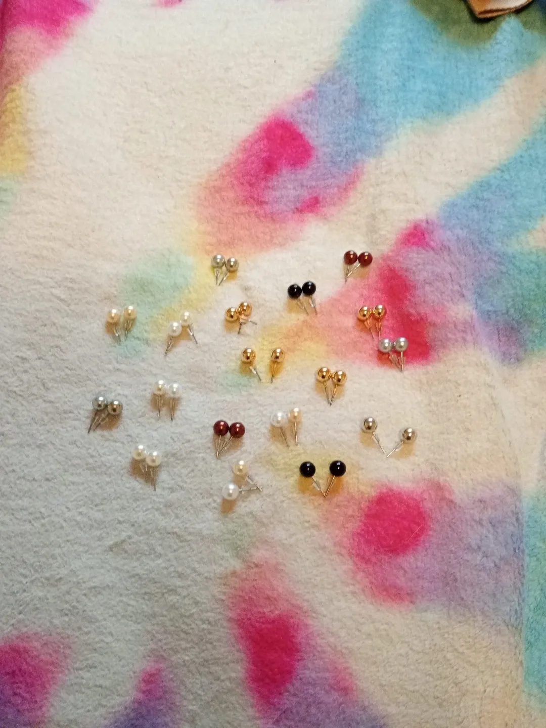 A collection of small stud earrings with pearl-like beads. Colours include silver, gold, brown, and black. Each pair features a small bead on a silver-tone post.