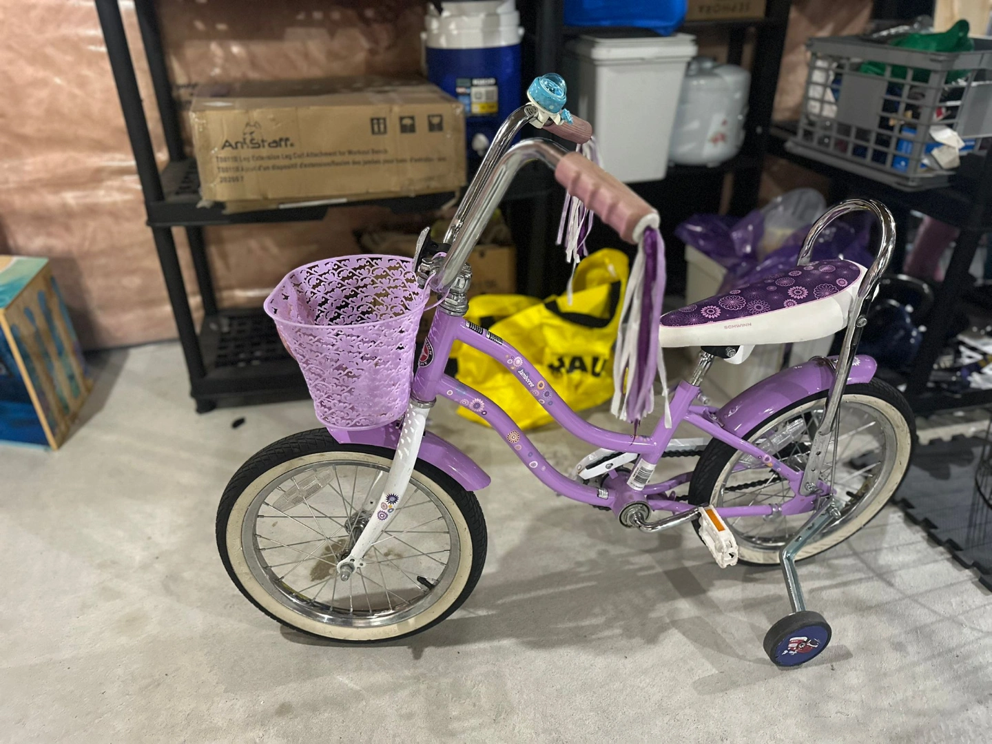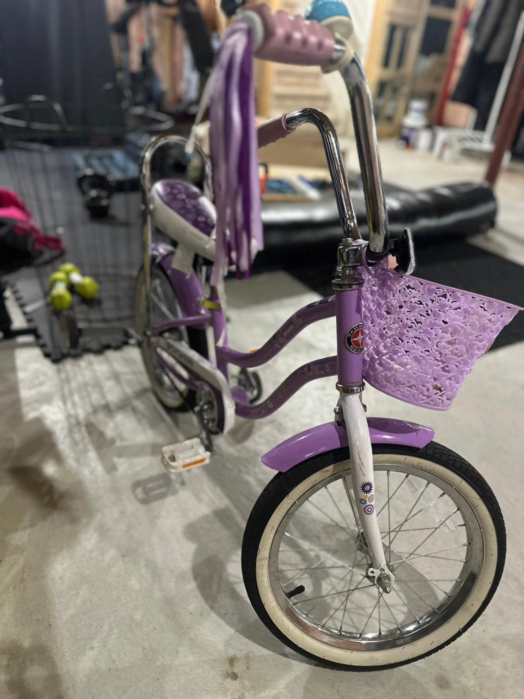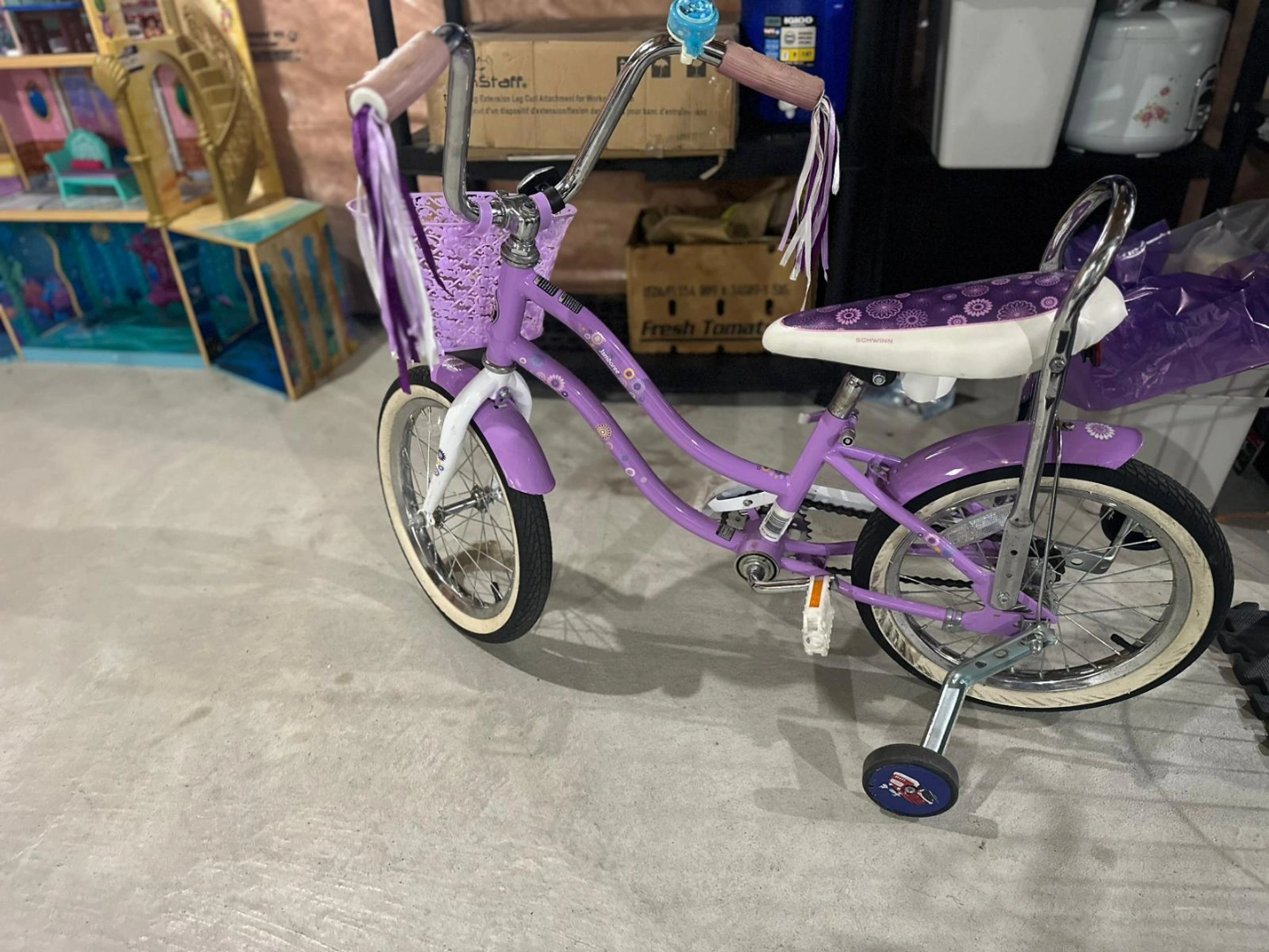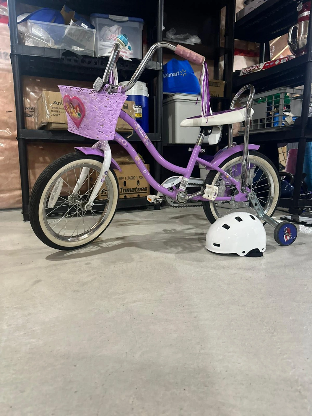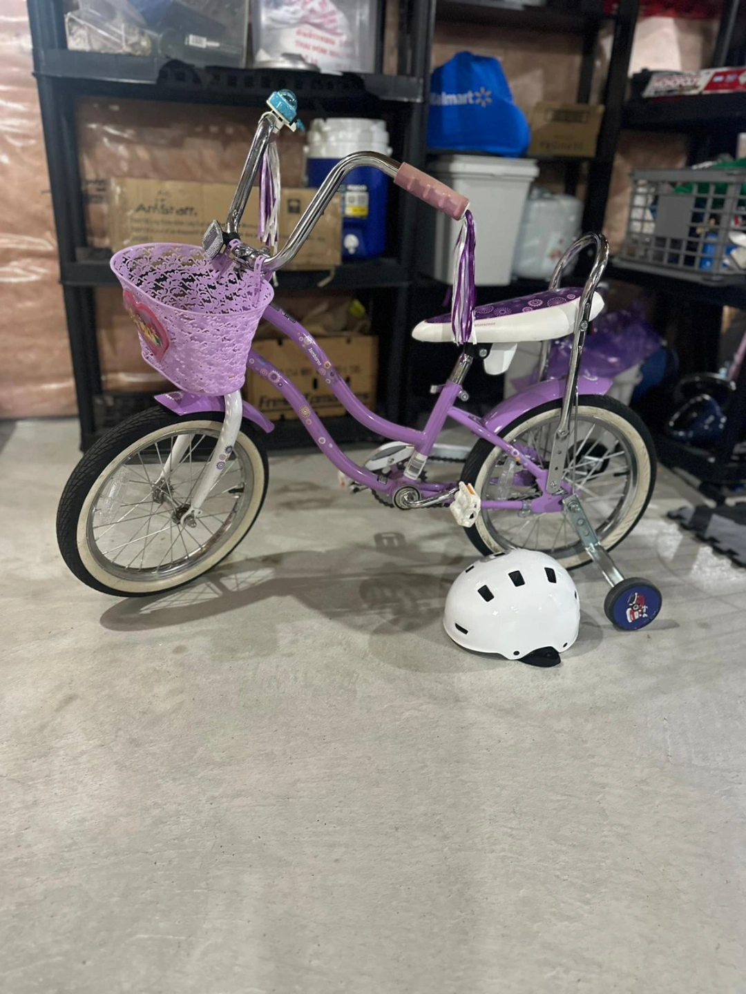 Girls' purple princess schwinn bike. Features a front basket, training wheels, and streamers on the handlebars. Great for younger riders. Comes with a white helmet.