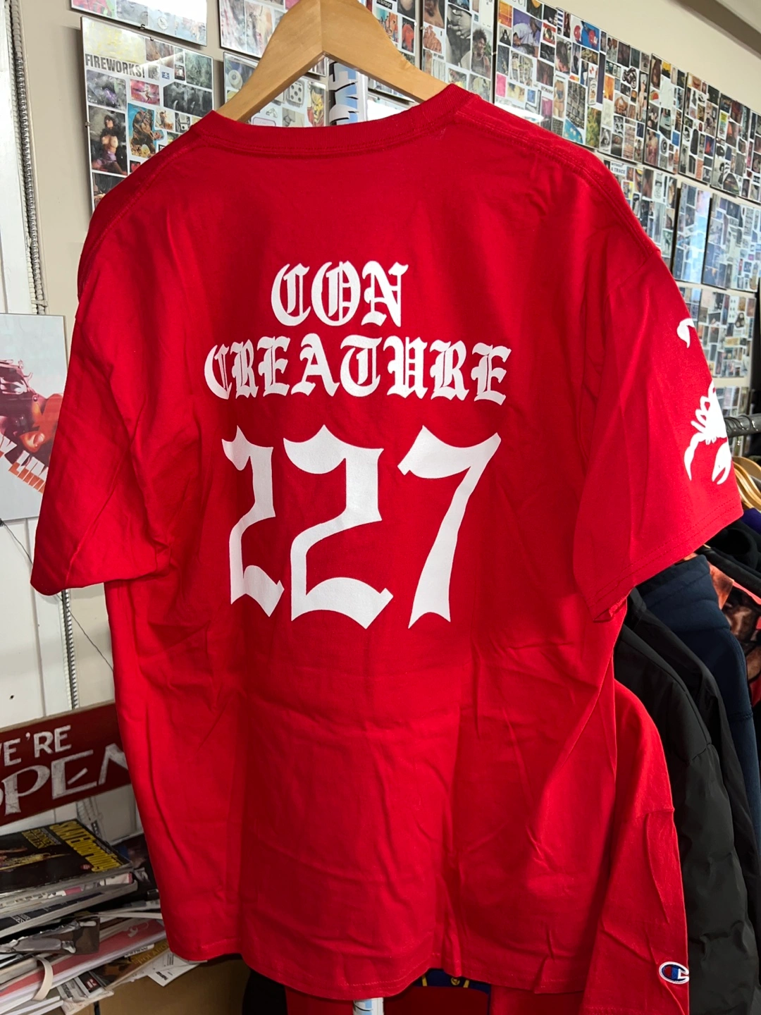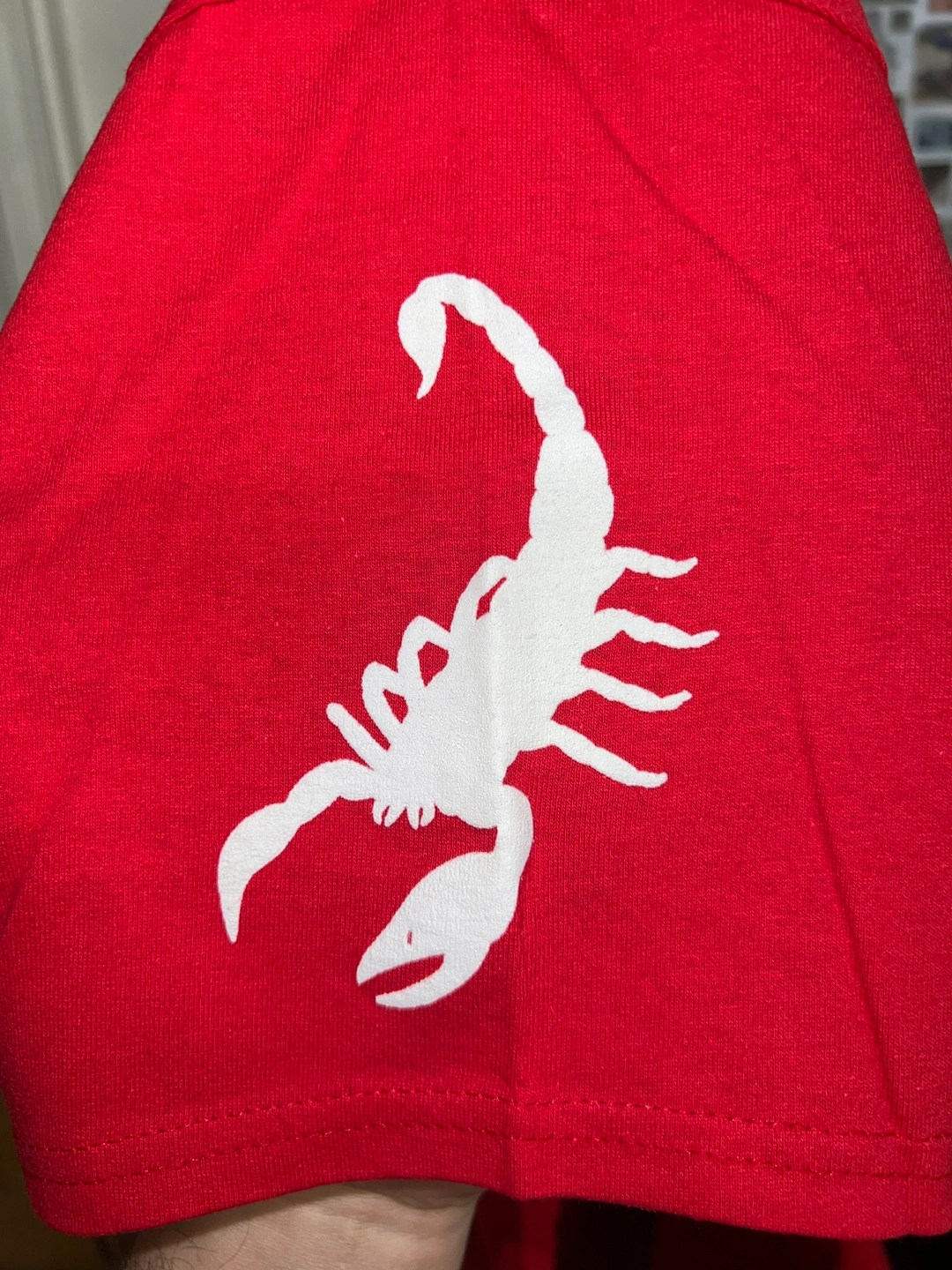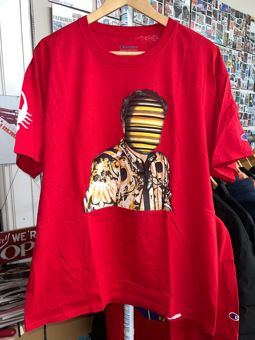 5Red Champion t-shirt. Features boldy James Versace tape album art design on the front and back. Scorpion graphic on sleeves. Size XL