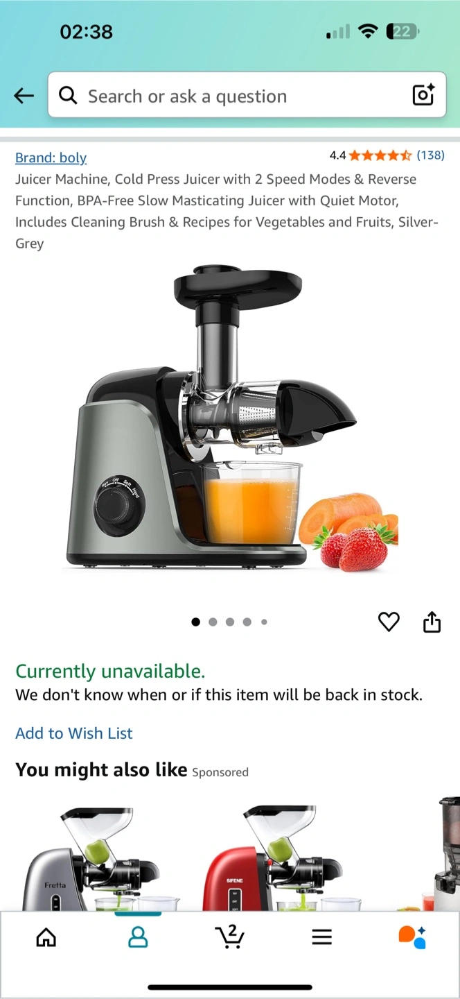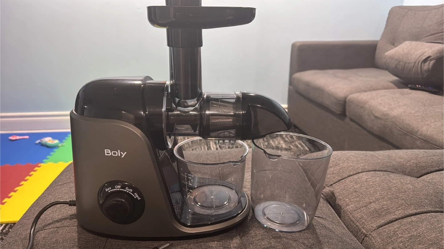 Cold press juicer. Two speed settings. BPA-free. Quiet motor. Includes cleaning brush and recipe book. Silver-grey. Box included. Reach me at 519-572-4572