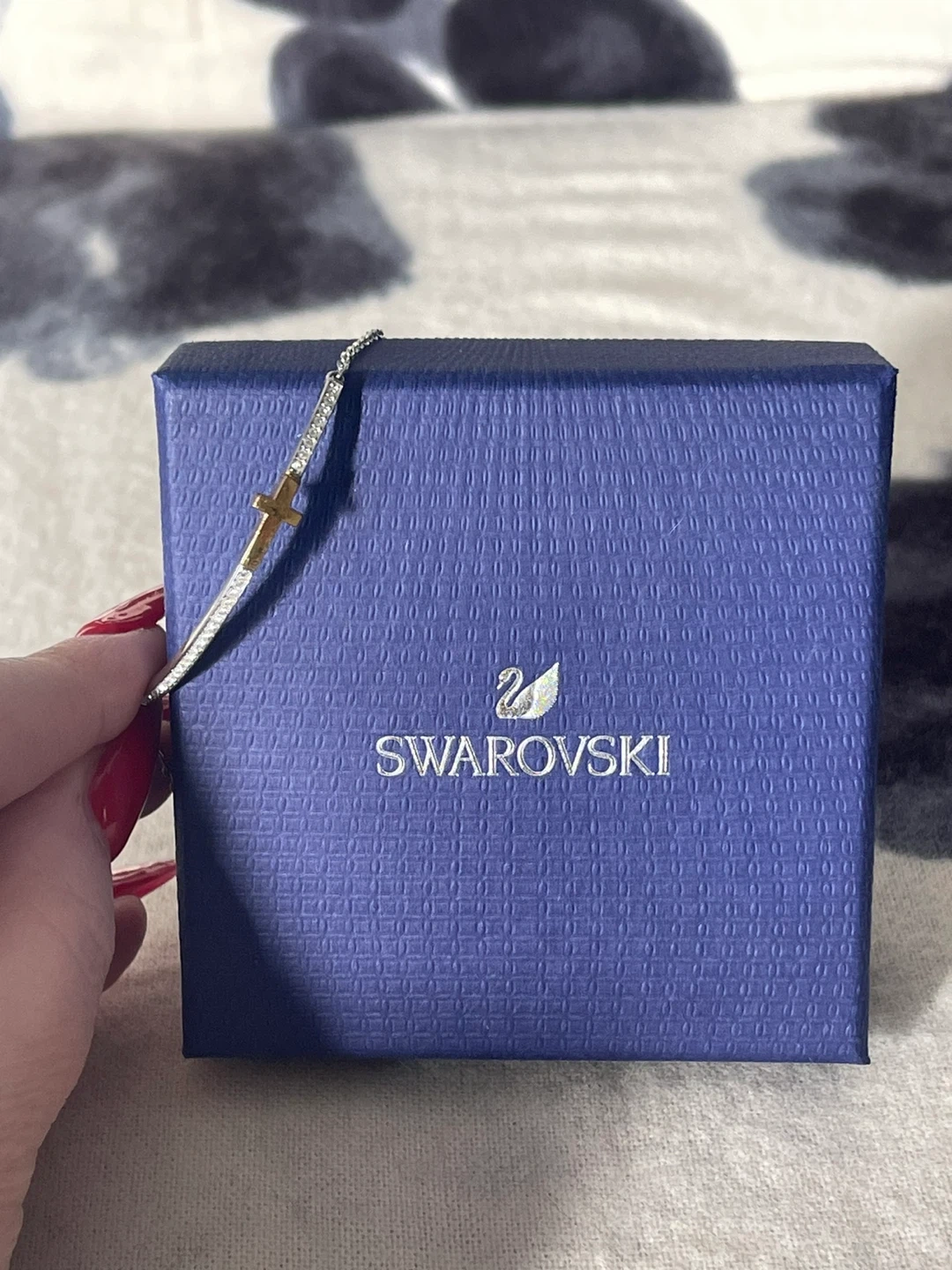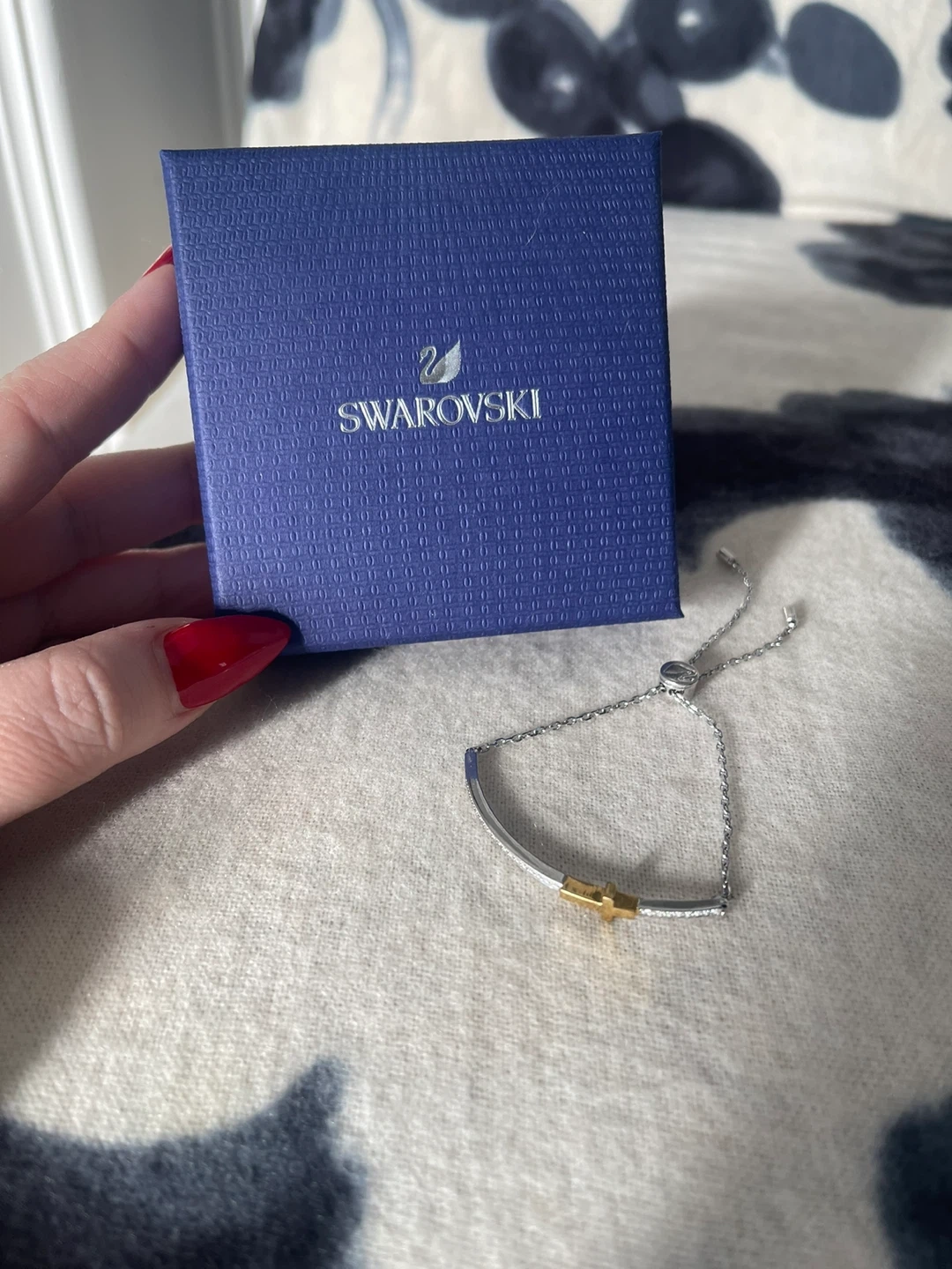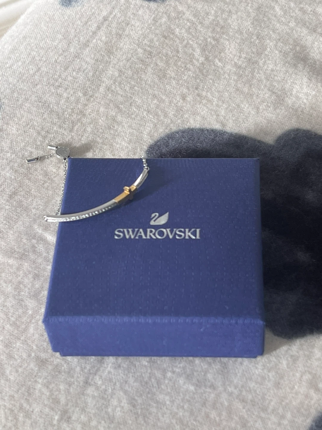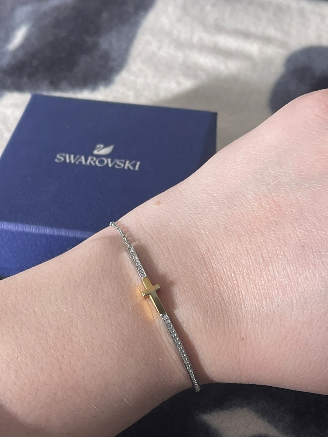 Authentic Swarovski bracelet. Stylish bracelet with a gold cross accent. Size adjustable and easy to put on by yourself, secure sliding closure. Ideal for versatile wear.