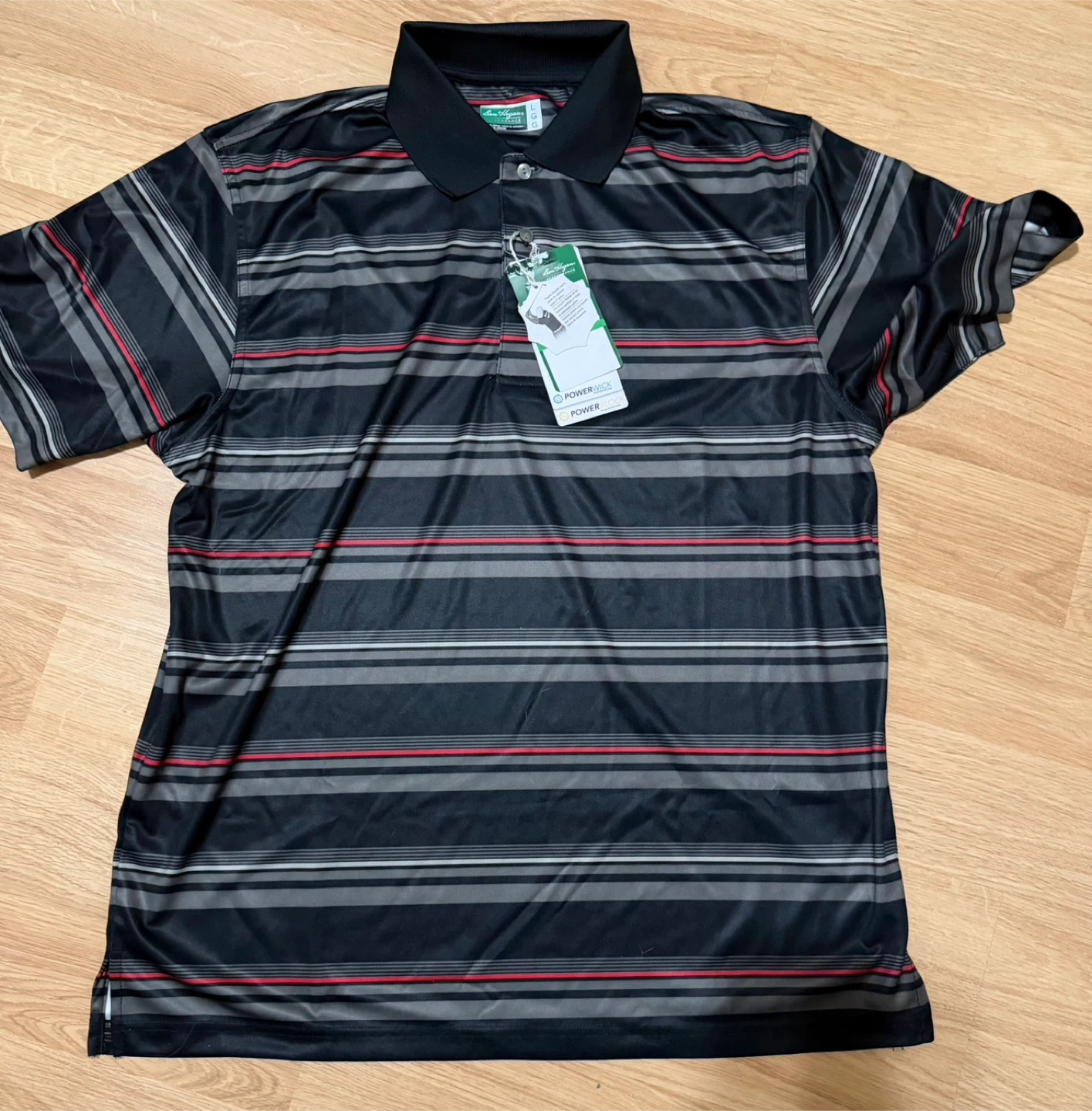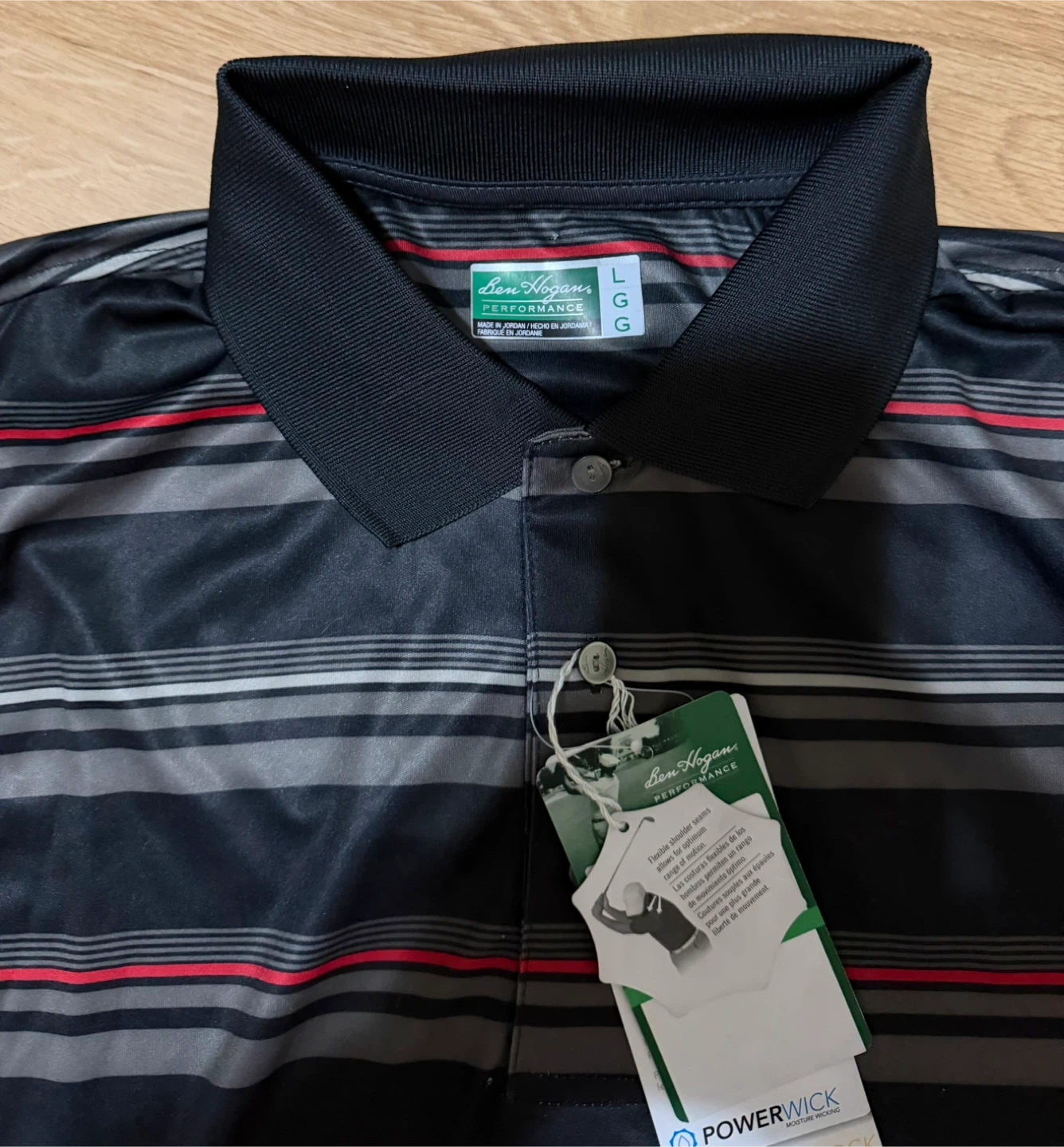 This is a Ben Hogan Performance golf polo shirt in black with gray and red stripes. It's a men's size large. The shirt features Power Wick technology for moisture management. Perfect for a day on the golf course!