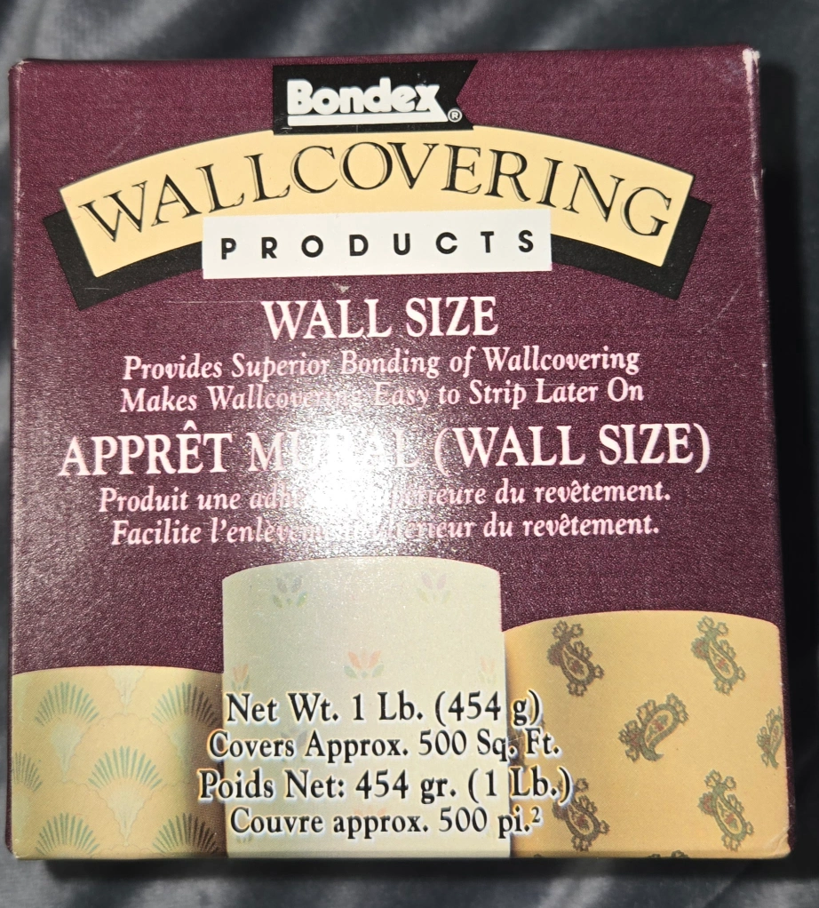 10Selling a box of Bondex Wallcovering Products, designed for wall-size applications! It provides superior bonding and makes wallcovering easy to strip later on. Net weight is 1 lb (454 g), and it covers approximately 500 sq ft