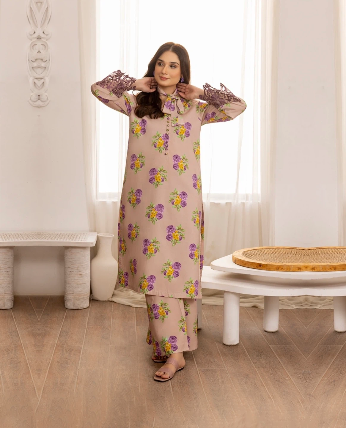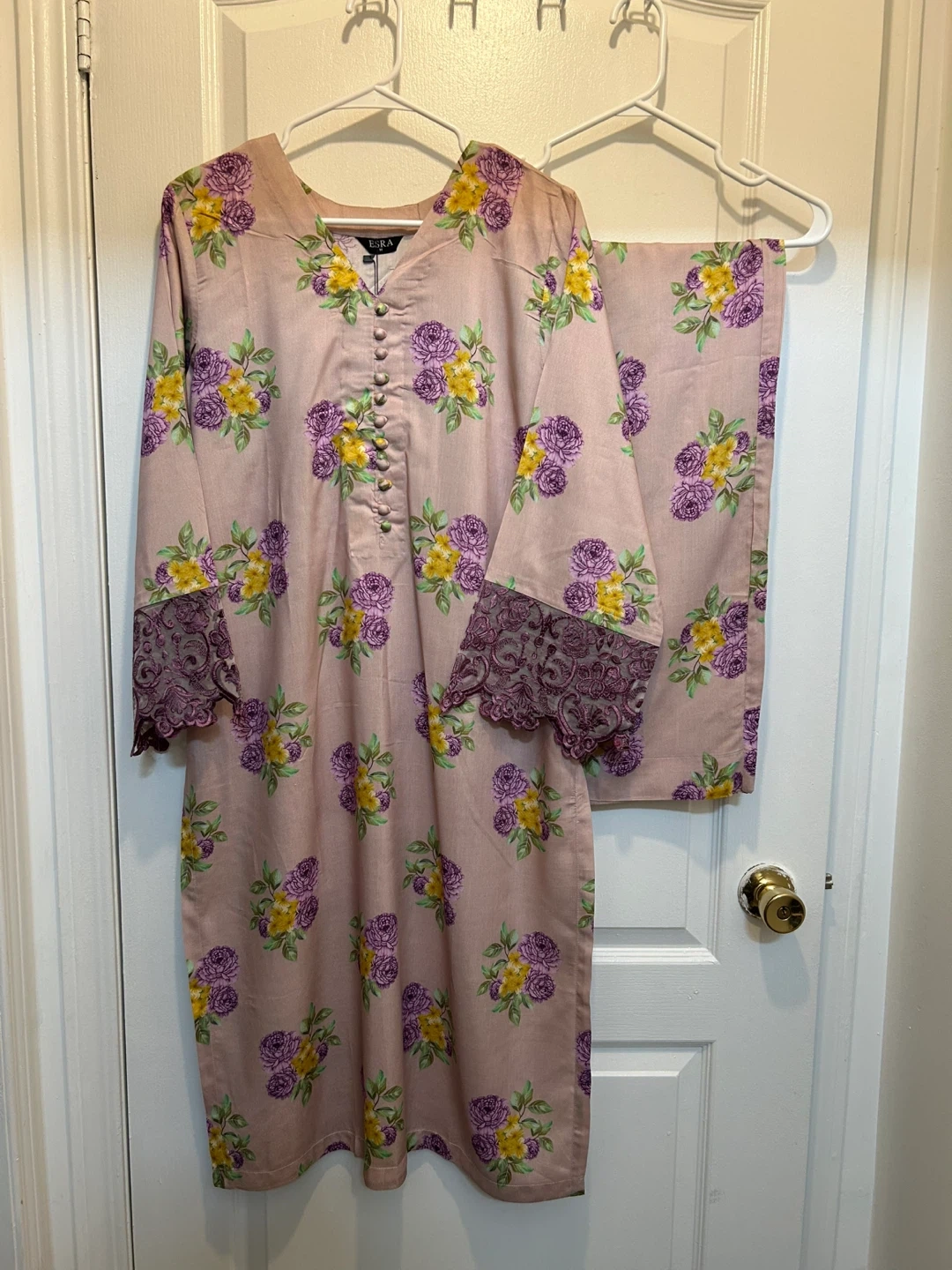 It features a lovely floral pattern in shades of purple and yellow on a light pink background. The sleeves have delicate lace detailing.