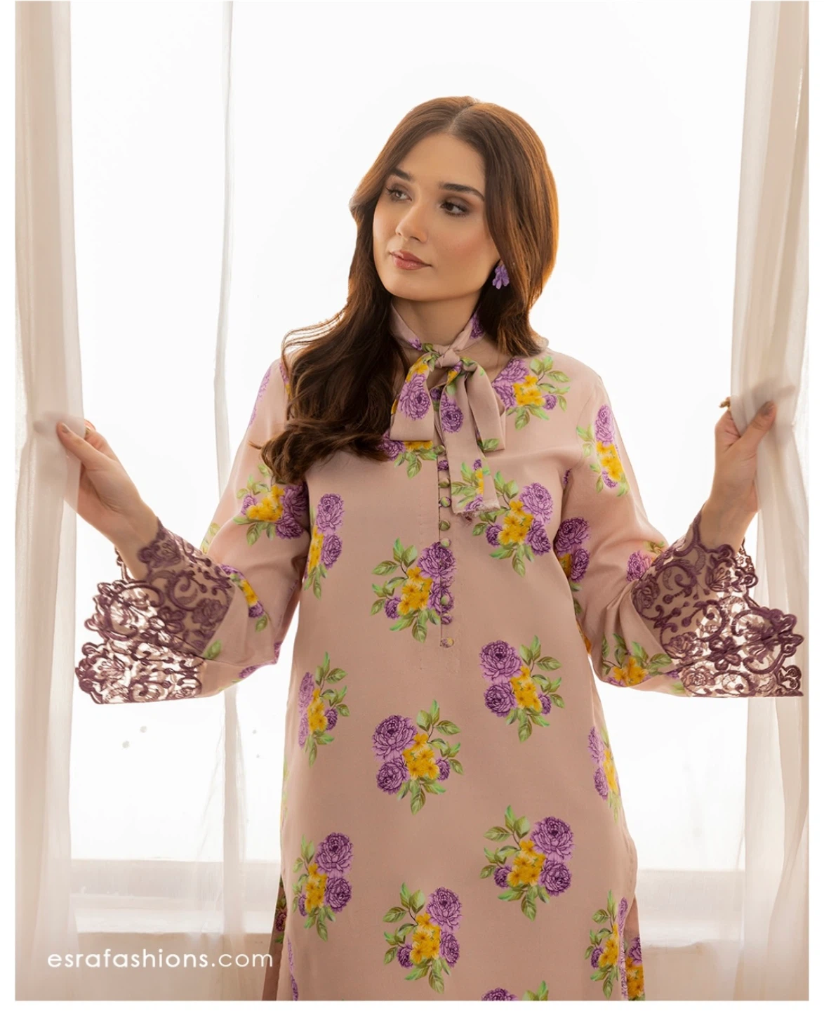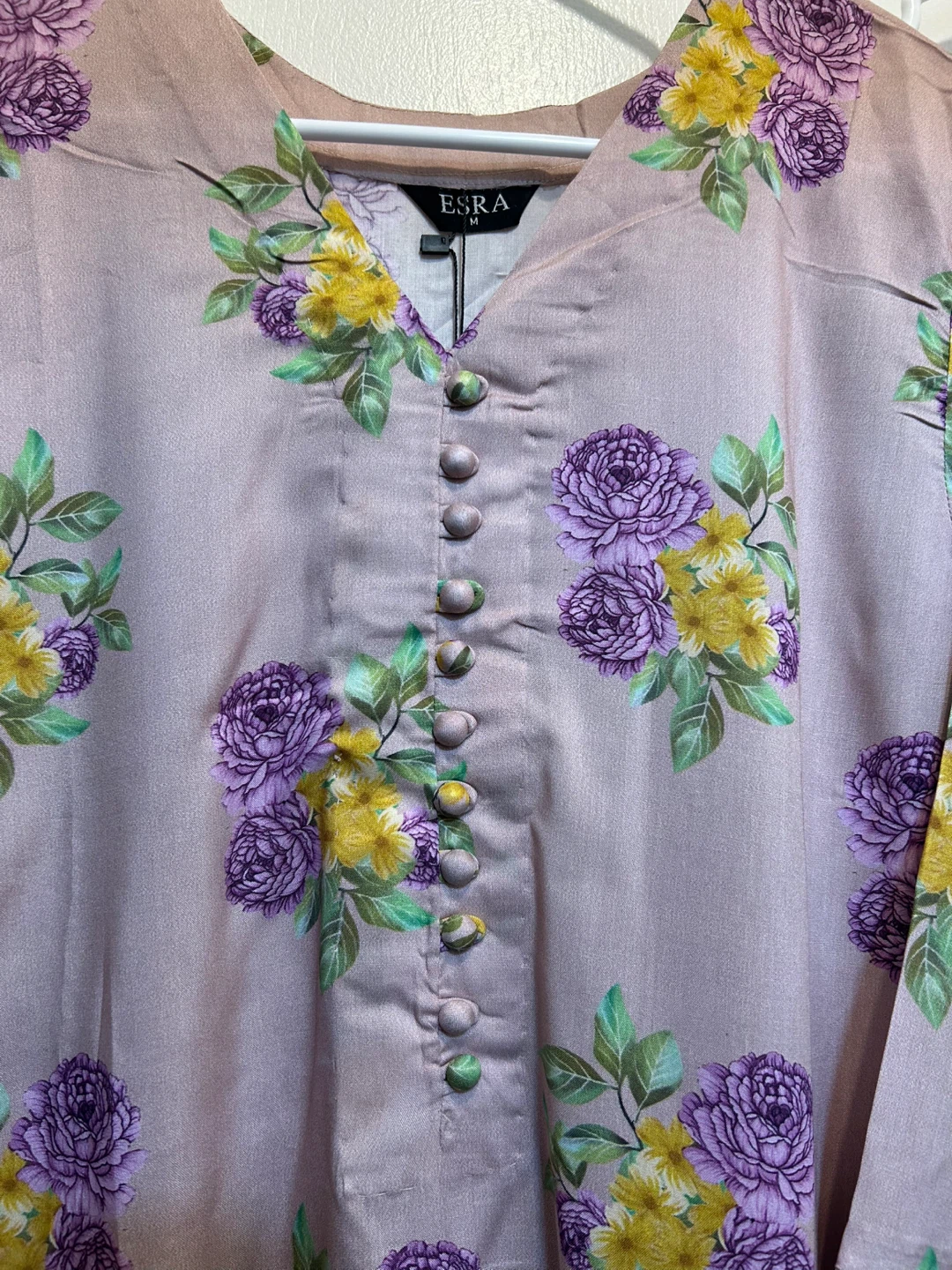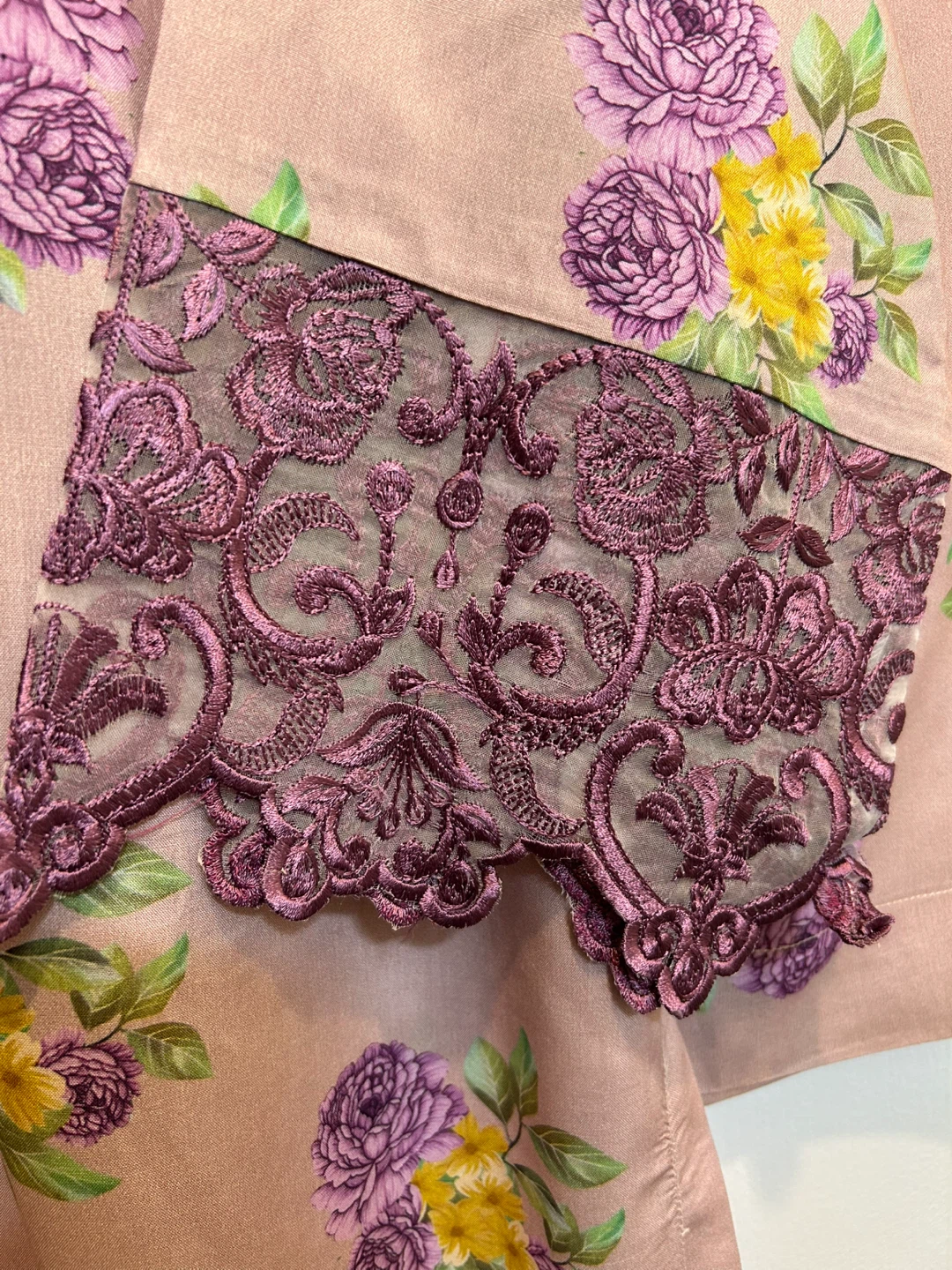 It features a lovely floral pattern in shades of purple and yellow on a light pink background. The sleeves have delicate lace detailing.