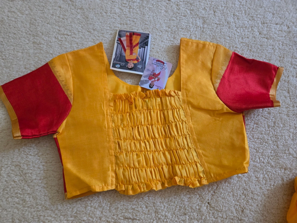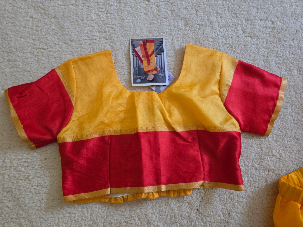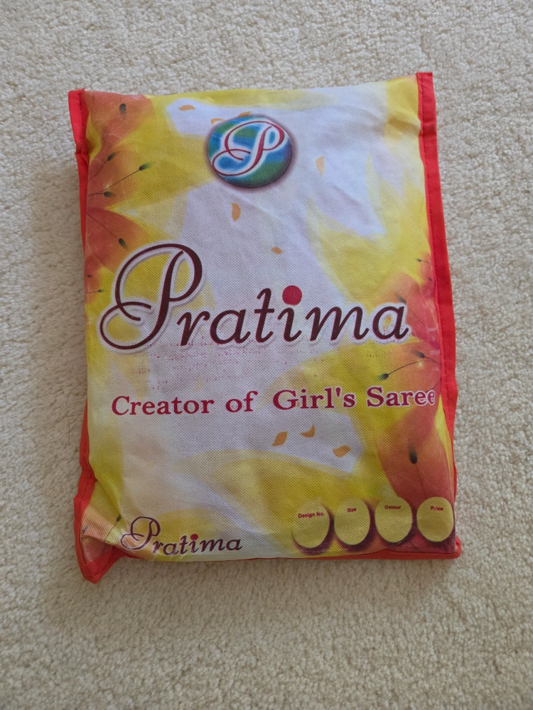 A beautiful Pratima brand saree for kids, featuring a vibrant yellow and red colour combination. Perfect for special occasions or cultural events!