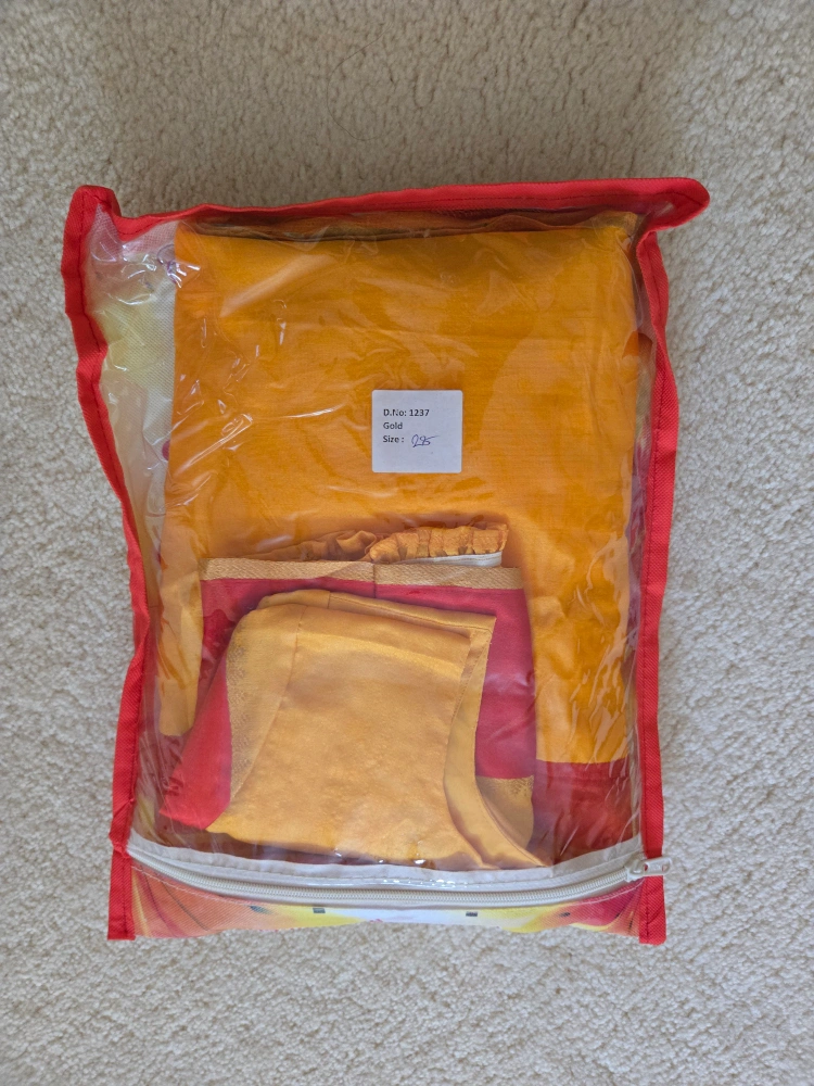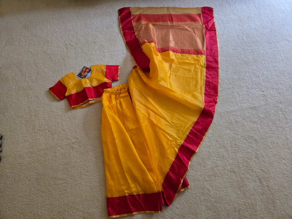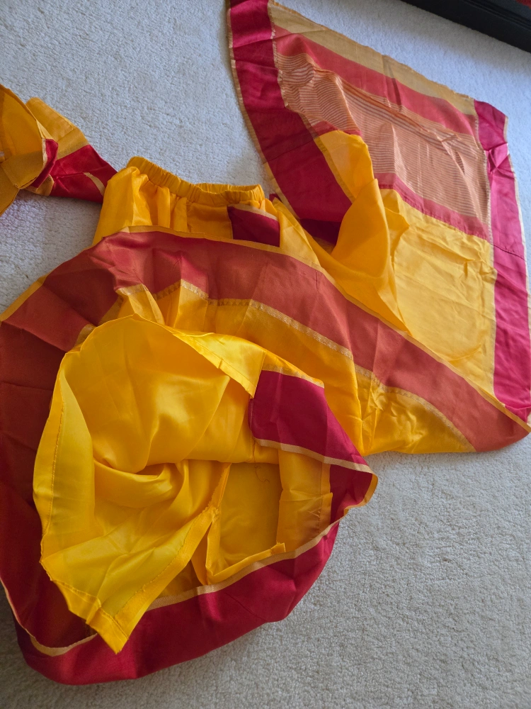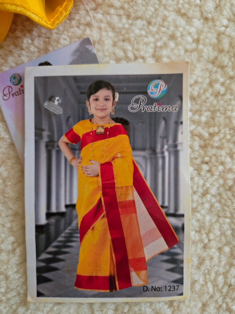 A beautiful Pratima brand saree for kids, featuring a vibrant yellow and red colour combination. Perfect for special occasions or cultural events!