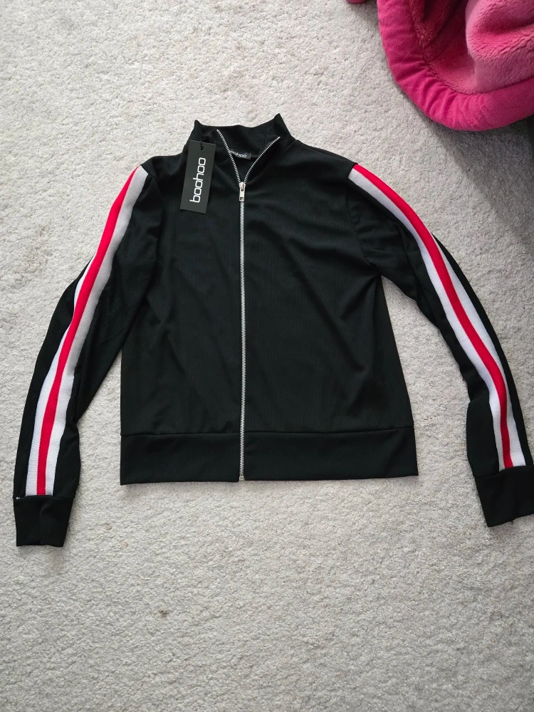 60Selling a Boohoo black track jacket. It has a zipper down the front and red and white stripes on the sleeves. Perfect for a casual look!