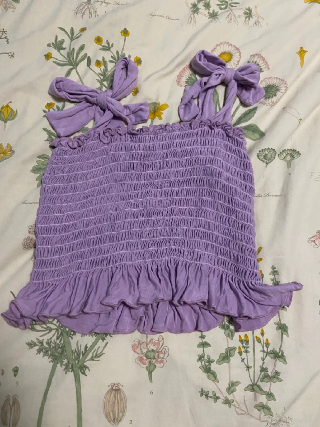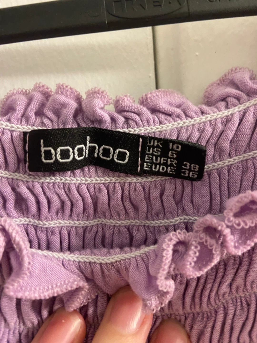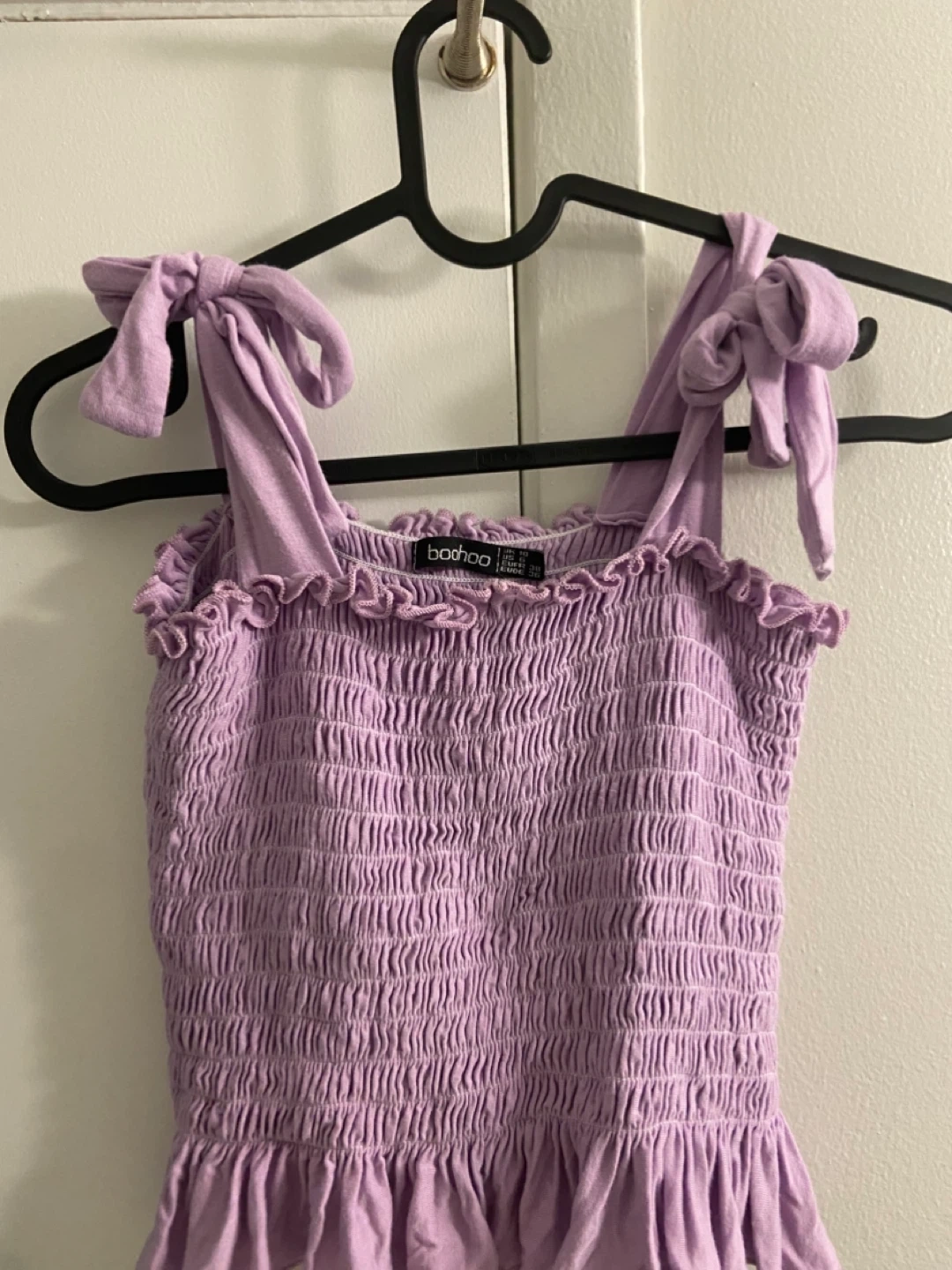 22Selling a cute Boohoo purple smocked top! It's a size 6. The top has tie straps and a ruffled hem. Perfect for summer!