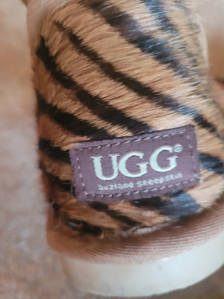 Cozy UGG boots made with genuine sheepskin and a stylish tiger print accent on the heel. They're lined with soft shearling for warmth. Perfect for keeping your feet toasty on chilly days!