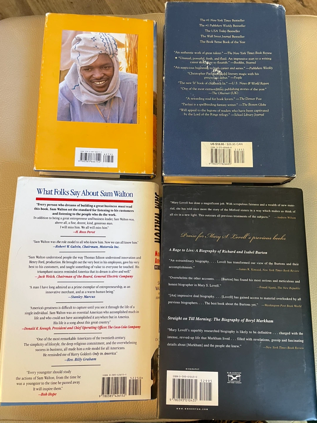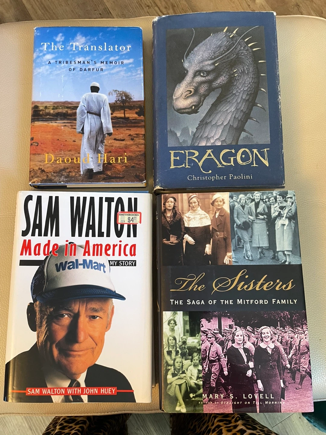 284Selling four books that include: . - The Translator: A Tribesman's Memoir of Darfur by Daoud Hari - Eragon by Christopher Paolini - Sam Walton: Made in America by Sam Walton with John Huey - The Sisters: The Saga of the Mitford Family by Mary S. Lovell Sold as a lot for 9.00 or 3.00 each Hardcover books . Well read condition. . Accepting etransfer for guaranteed hold and cash transactions are FCFS. Please see my other listings for books and much more .