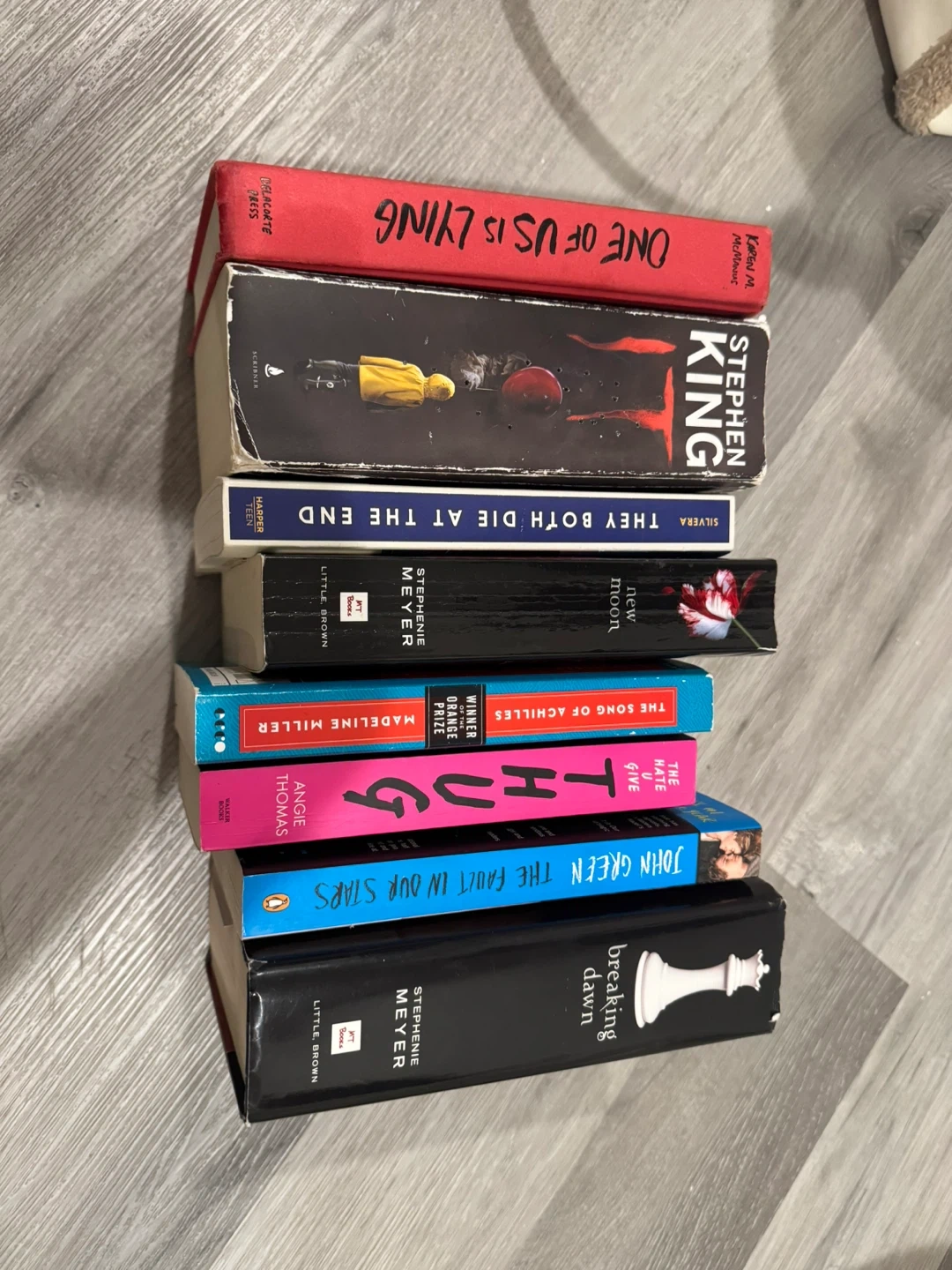 55YA reads (includes all books for $30) - One of Us is Lying by Karen M. McManus - IT by Stephen King - They Both Die at the End by Adam Silvera - New Moon by Stephenie Meyer - Breaking Dawn by Stephenie Meyer - The Hate U Give by Angie Thomas - The Fault in Our Stars by John Green