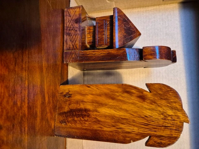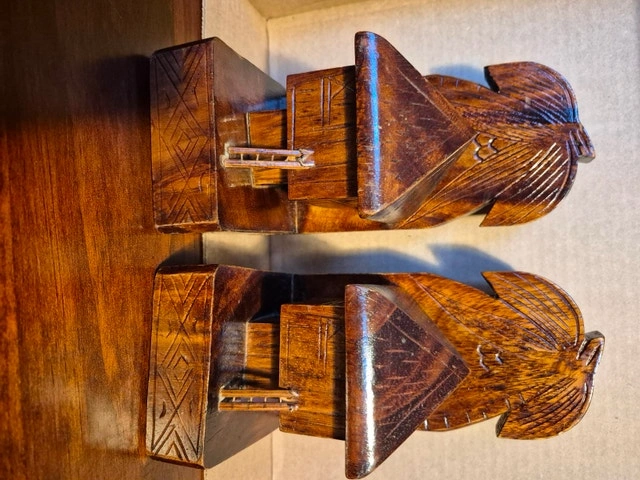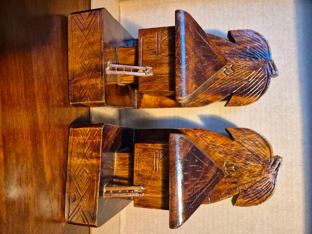 0A pair of hand-carved bookends. They're intact and quite well made. Dimensions: 8" tall, 4.5" deep, 3.5" wide. $15.00
