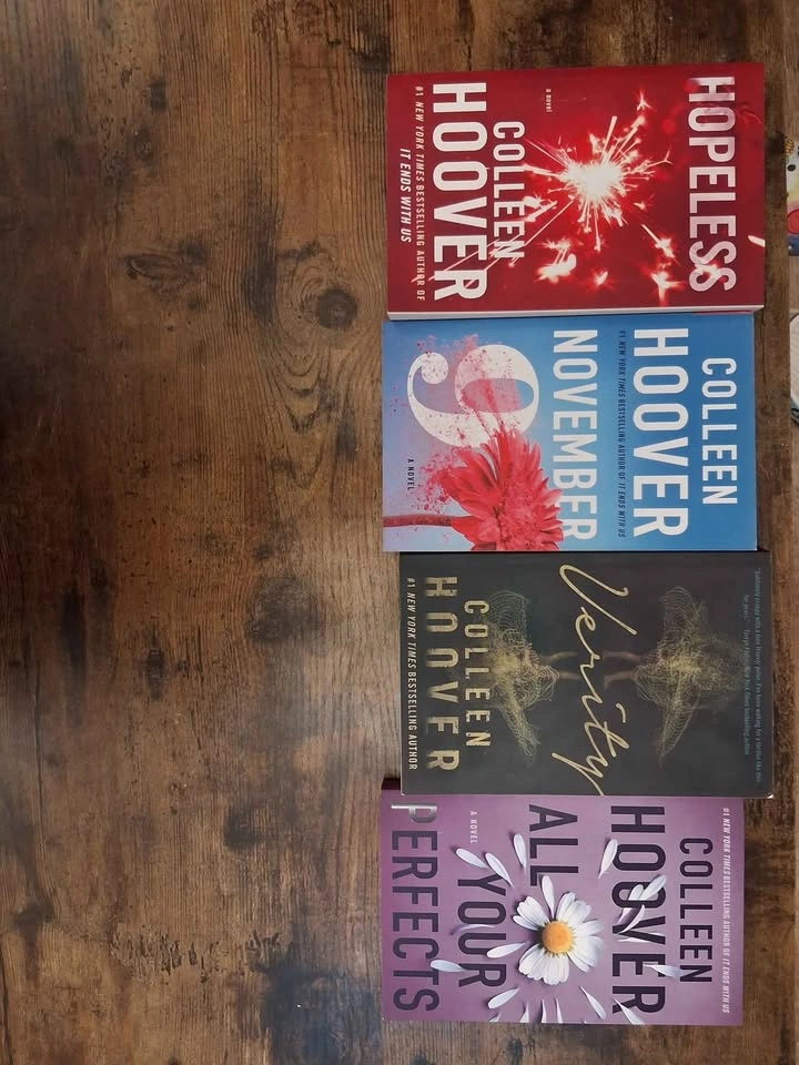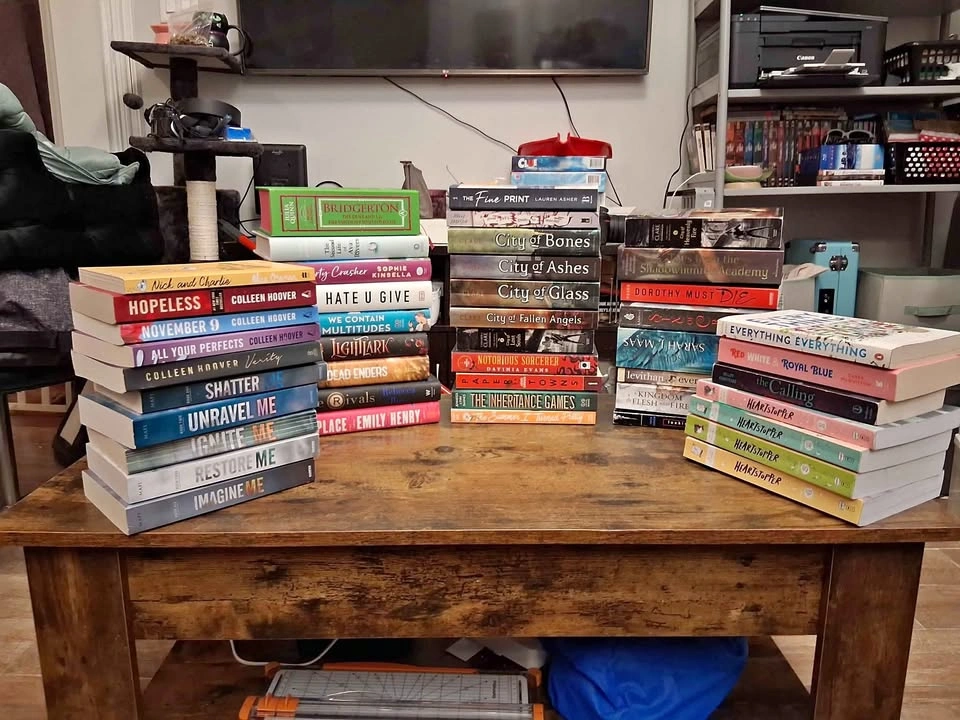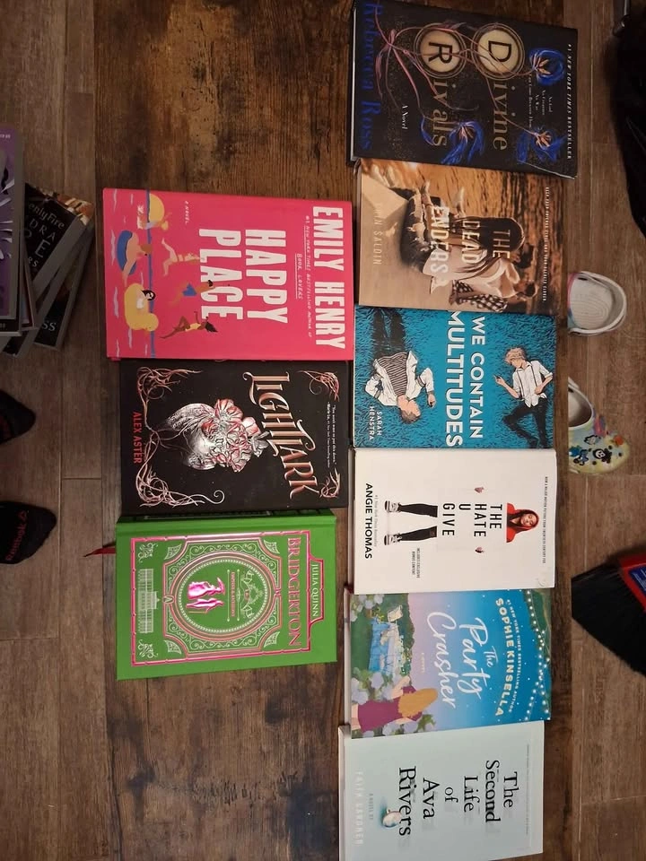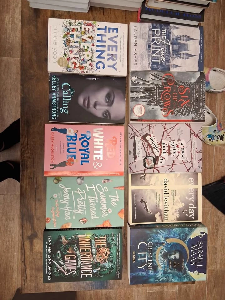 15I have hard cover books ($15 each) and soft cover books ($10 each). Or take the entire lot for $300. Hard Cover Books: - Divine Rivals by Rebecca Ross - the dead enders by Erin saldin - we contain multitudes by Sarah henstra -the hate you give by Angie Thomas -the party crasher by Sophie Kinsella -the second life of ava rivers by faith Gardner - happy place by Emily Henry - lightlark by Alex aster -Bridgerton book 1 and 2 by Julia Quinn Soft Cover : -Shatter Me Series by tahereh mafi, books 1,2,3,4 and 6. $10 each or $40 for the set -the mortal instrument series by Cassandra clare, books 1-6. $10 each or $35 for the set. -tales from the shadow hunter academy by Cassandra clare -books 1-4 of the heartstopper series by Alice oseman and nick and Charlie by Alice oseman , $10 each or $25 for all -Colleen hoover books; Hopeless, November 9, Verity, All your perfects. $10 each or $25 for the set -paper towns by John green -looking for Alaska by John Green - a kingdom of flesh and fire by Jennifer L armentrout -notorious sorcerer by Davina Evans - Dorothy must die by Danielle Paige - the inheritance games by Jennifer Lynn Barnes -the summer I turned pretty by Jenny han - red white and royal blue by Casey mcquiston - French edition of book 2 of the Ceescent series by Sarah j Maas -the fine print by Lauren Asher -six of crows by Leigh bardugo -a good girls guide to murder by holly Jackson -everyday by David leviathan -the calling by Kelley Armstrong - everything everything by nicola yoon