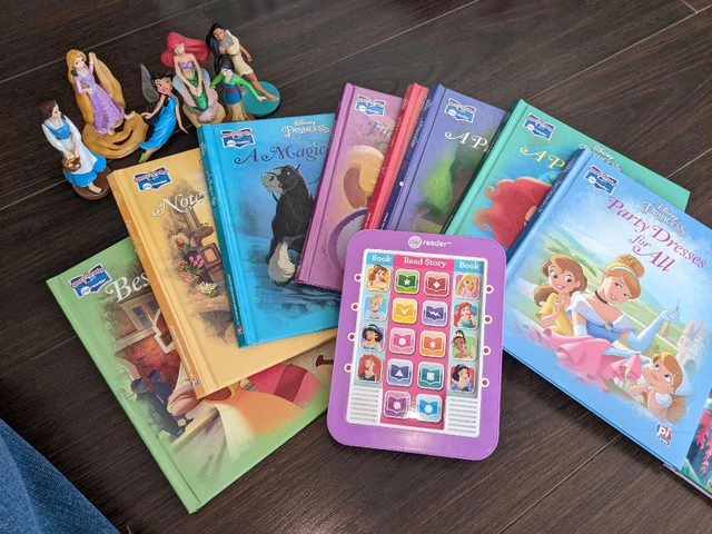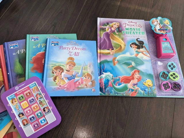 0Do you have a princess loving child? This is the set for you. The reader reads the story to your child. Books are in excellent used condition. The princess movie theater projector display slides of each story using a flashlight device. Everything in the set works. Throwing in princess figurines for free (well loved).