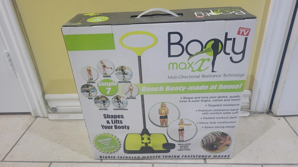 10Brand new in box. Multi-directional resistance technology. Shapes and lifts your booty. Includes resistance band with ankle cuff. Padded workout deck. Space saving design.