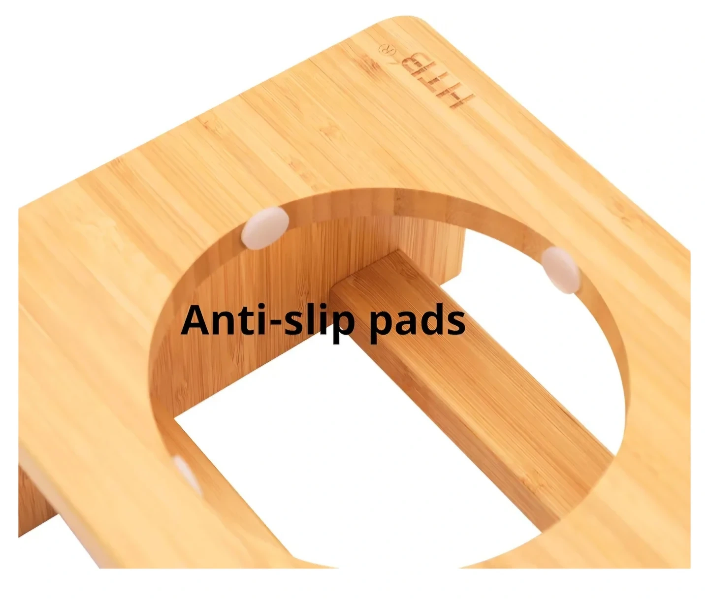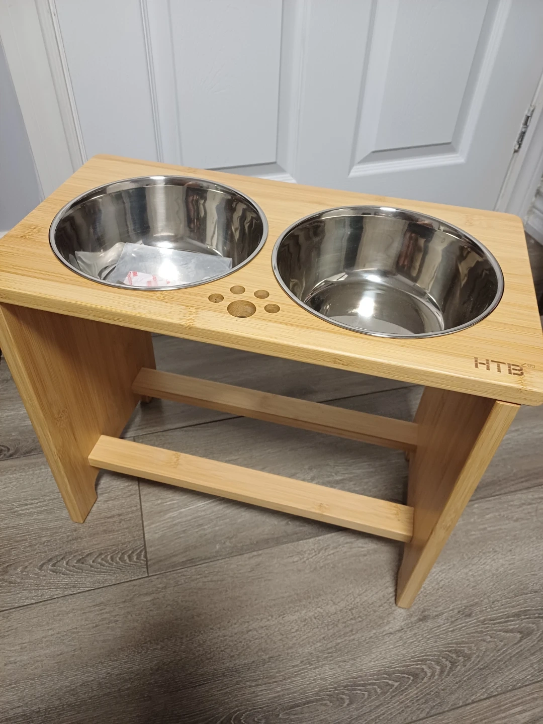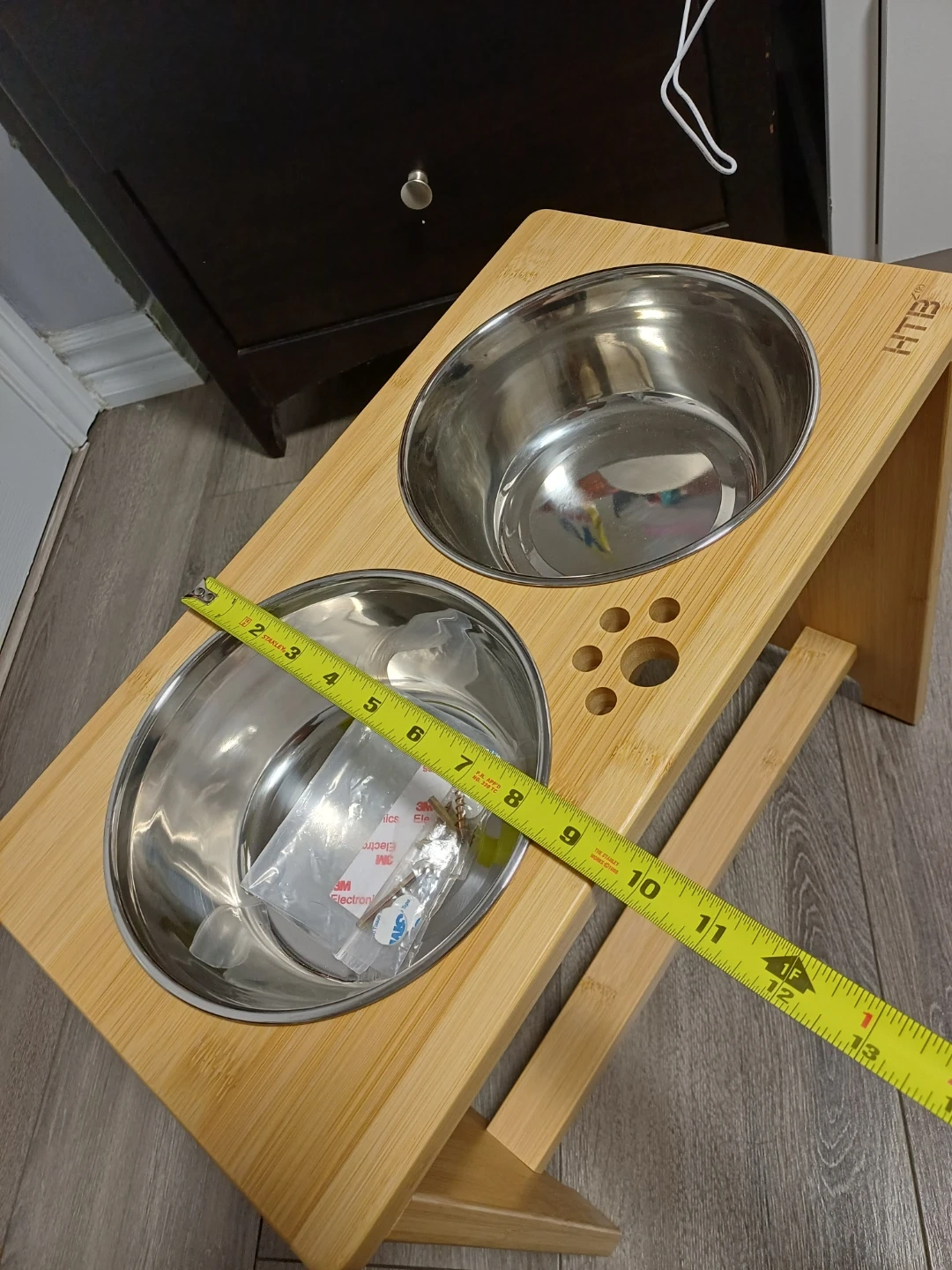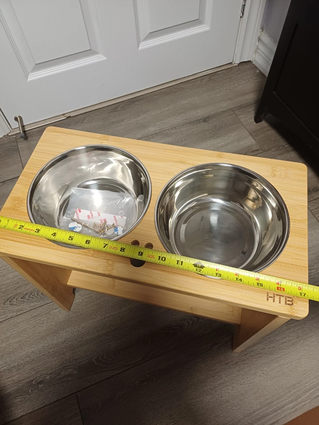 Elevated pet feeding station with two stainless steel bowls. Bamboo stand construction measuring 17.3 inches long, 9.5 inches width and about 14 inches in height which helps reduce strain on your pet's neck, bowls diameter is approximately 7 inches.