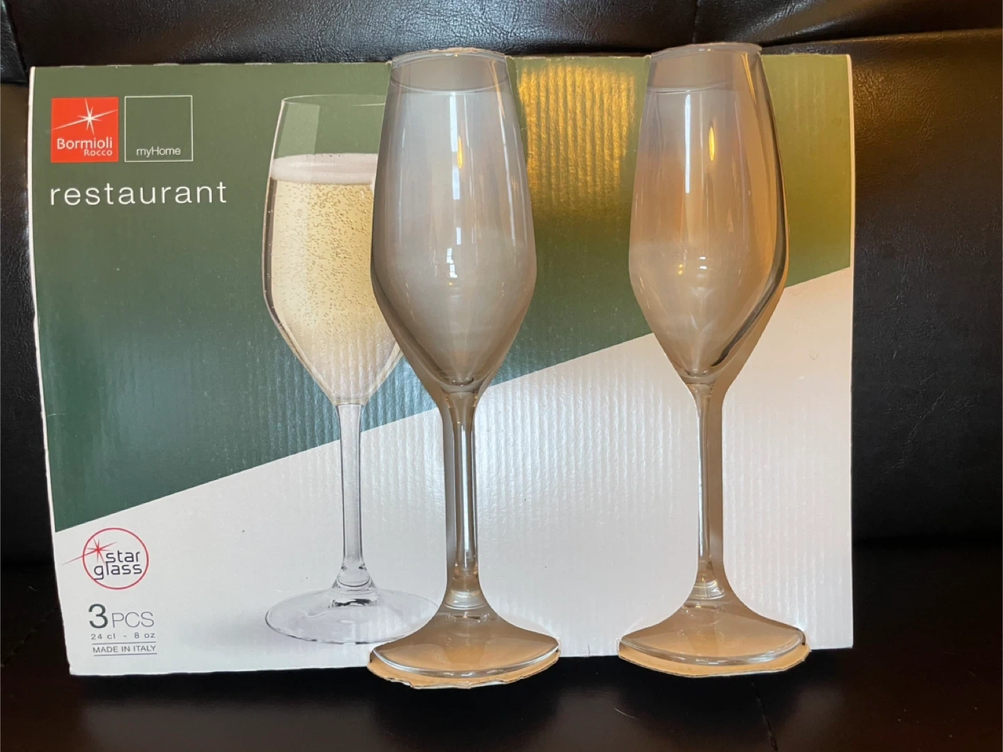10Selling a set of Bormioli Rocco Restaurant champagne flutes. The box includes 3 glasses, each with a capacity of 24 cl (8 oz). They are dishwasher safe, making them easy to clean. Perfect for celebrations or adding a touch of elegance to your everyday life! Or a perfect gift idea for a wedding, shower, or housewarming!