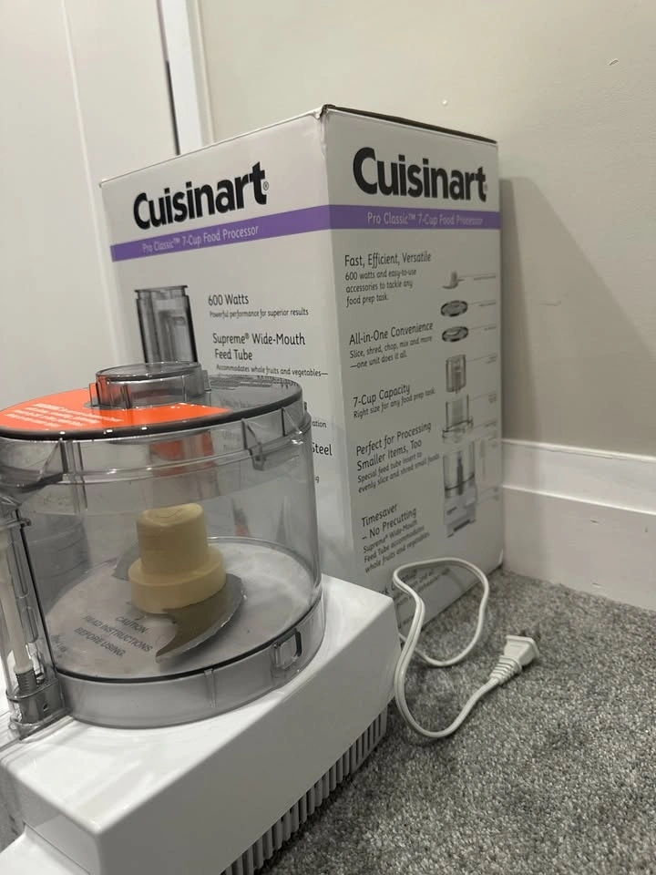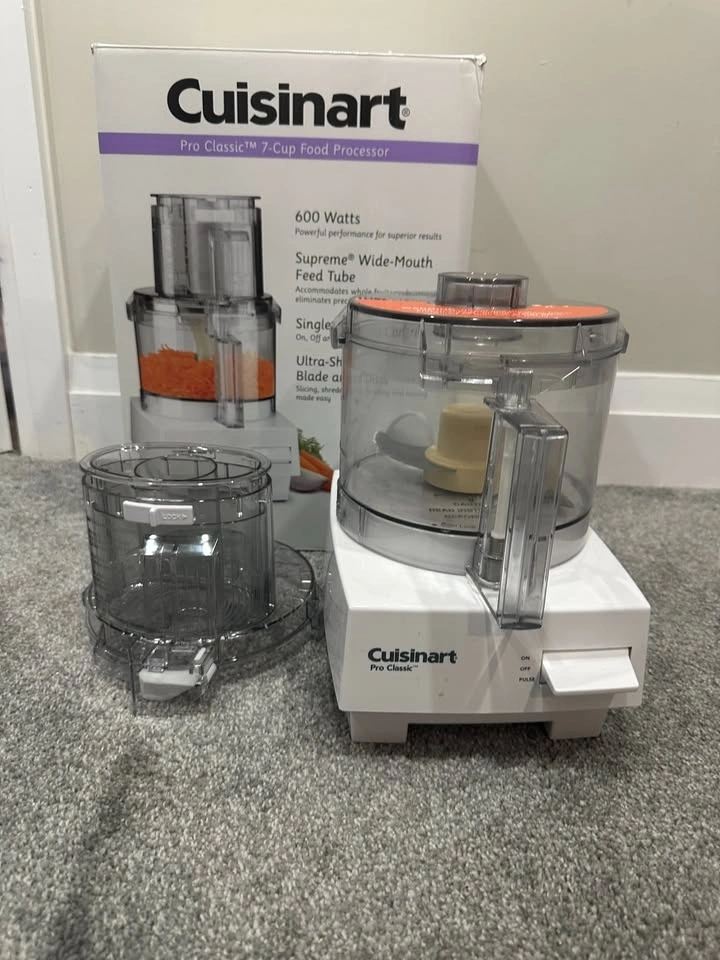 Unlock culinary brilliance with the Cuisinart Pro Classic 7-Cup Food Processor! This powerhouse appliance is your secret weapon for flawless meal prep, transforming everyday cooking into an effortless joy. From perfectly sliced veggies to finely chopped nuts and silky-smooth purees, experience professional results in your home kitchen. Key Features: Powerful Performance: Robust motor easily handles tough ingredients. Generous 7-Cup Capacity: Ideal for family meals or batch prepping. Effortless Control: Simple on/off/pulse controls for precision. Easy to Clean: Removable parts are dishwasher safe for quick cleanup. This Cuisinart Pro Classic (Model DLC-10SYP1A) is in perfect working condition. Location: Rymal Rd & Columbus gate. Cash only. Bug, pet & smoke free home. If post is still up, item is available.