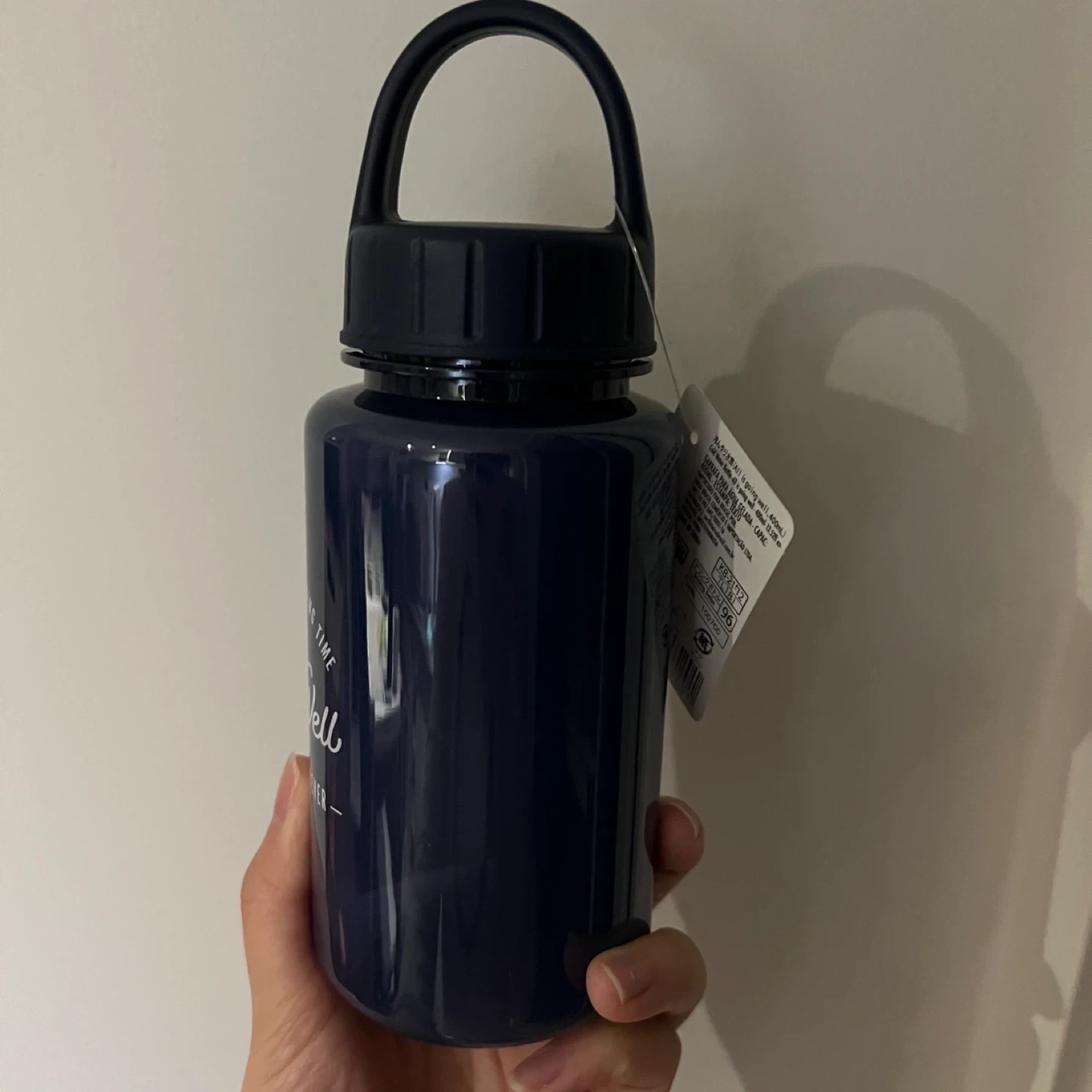 Dark blue water bottle has a capacity of 350ml and includes a cooling stick. You can make ice and put in it to keep the bottle cool. Brand new.