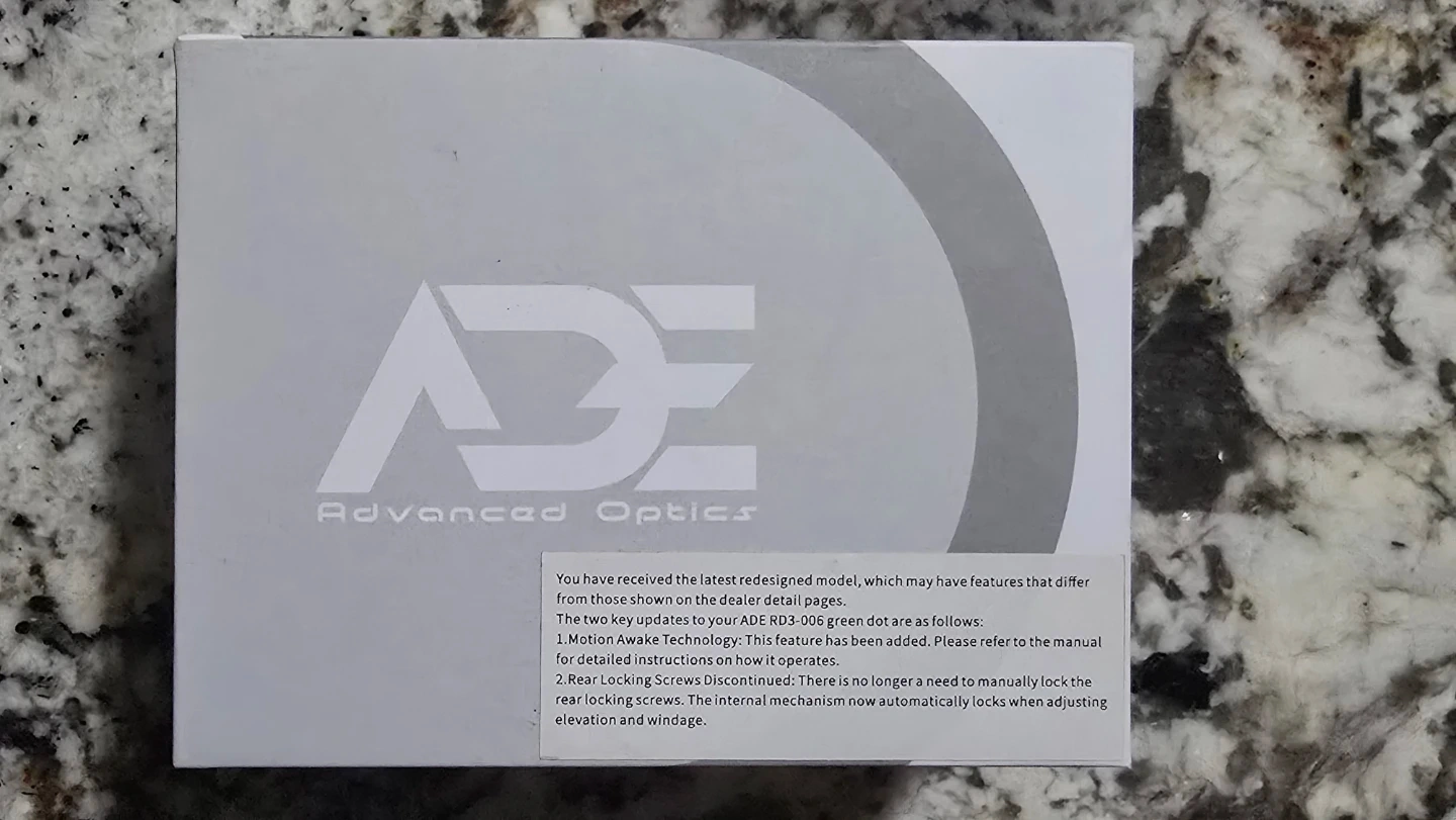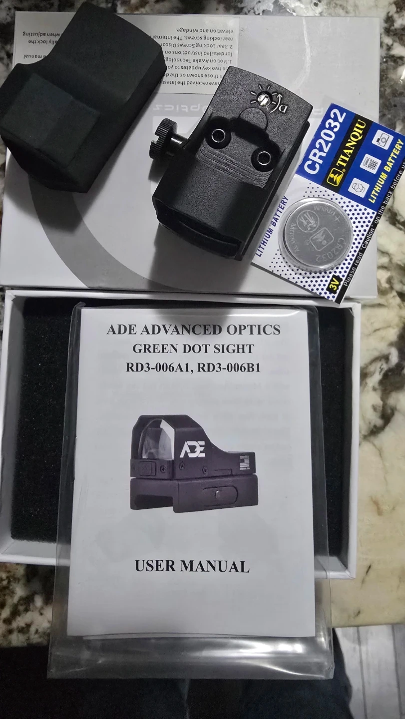 This is an ADE Advanced Optics Green Dot Sight, model RD3-006A1 or RD3-006B1. It comes with a CR2032 lithium battery. It features Motion Awake Technology and rear locking screws that automatically adjust elevation and windage.