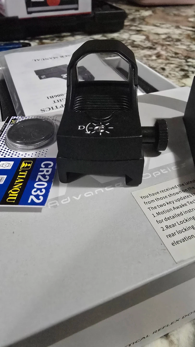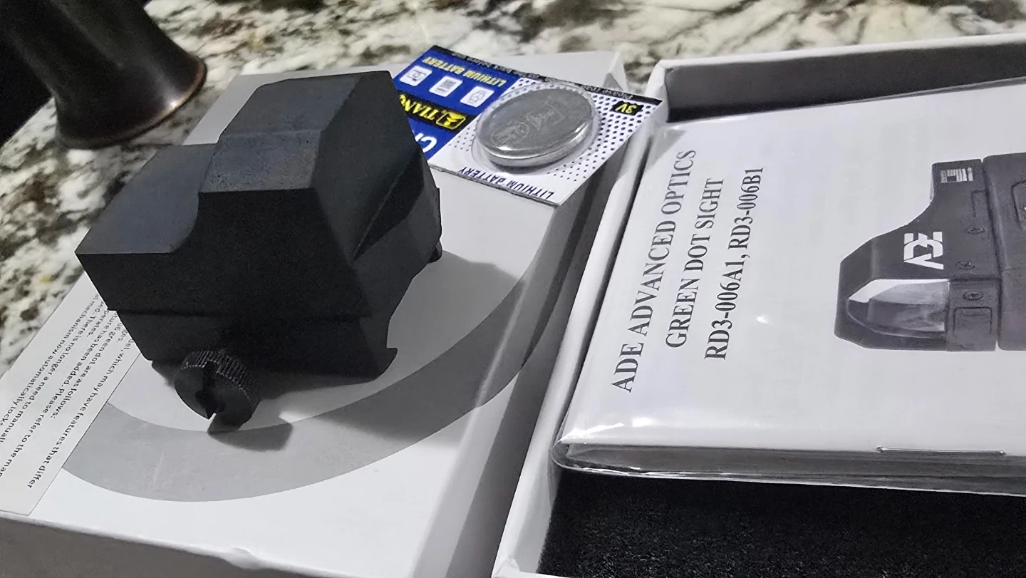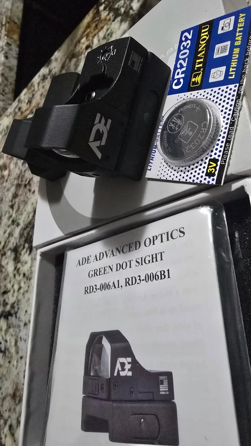 This is an ADE Advanced Optics Green Dot Sight, model RD3-006A1 or RD3-006B1. It comes with a CR2032 lithium battery. It features Motion Awake Technology and rear locking screws that automatically adjust elevation and windage.