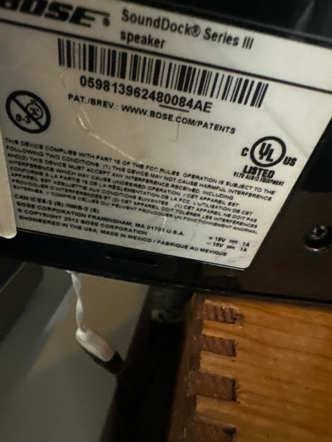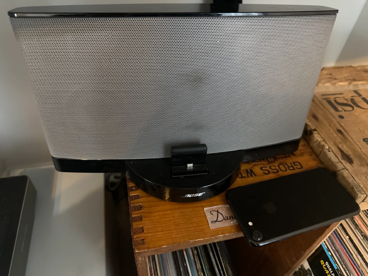 Black Bose SoundDock Series III speaker. Features a 30-pin dock for older iPhones and iPads. Includes power cable. Audio input jack enables Bluetooth connectivity. Bluetooth adapter sold separately!