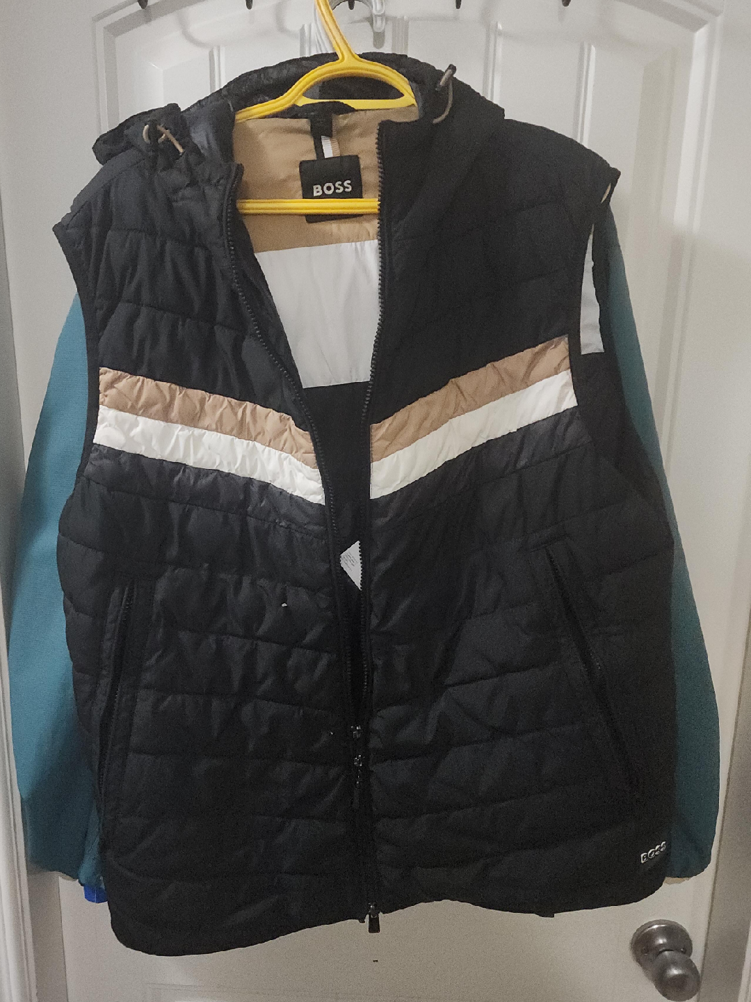 83Selling a BOSS black padded vest. It's in great condition and perfect for layering during the cooler months! The vest features a stylish design with stripes across the chest. Feel free to message me with any questions!