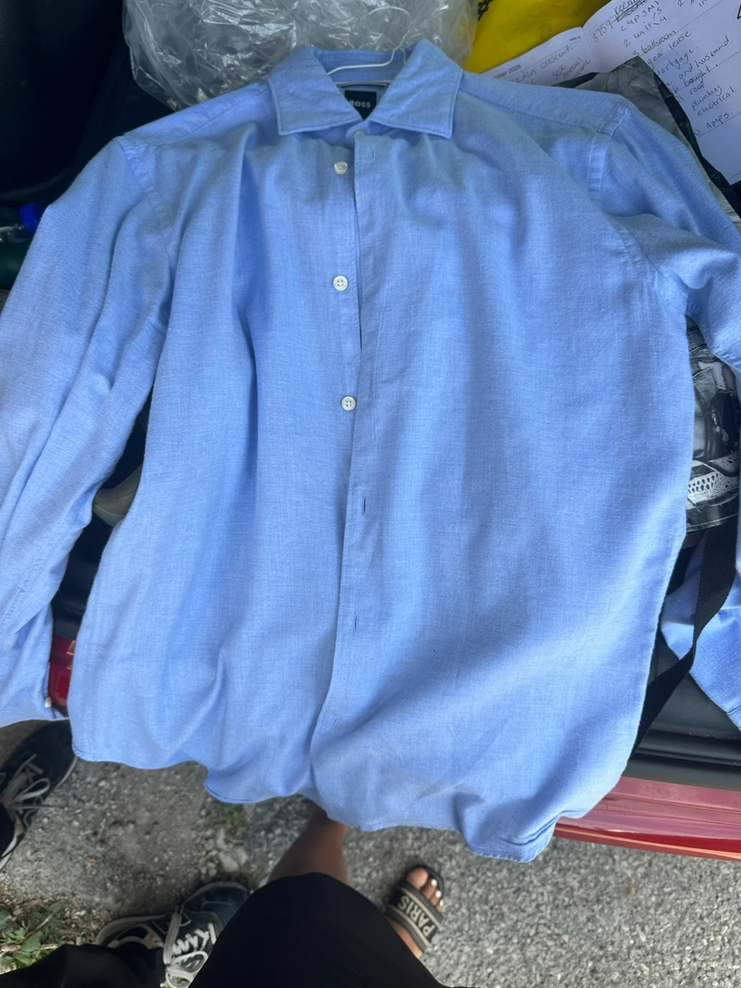 Here's a light blue button-up shirt from BOSS. It's in great condition and ready for a new home! Perfect for dressing up or down, this shirt is a versatile addition to any wardrobe
