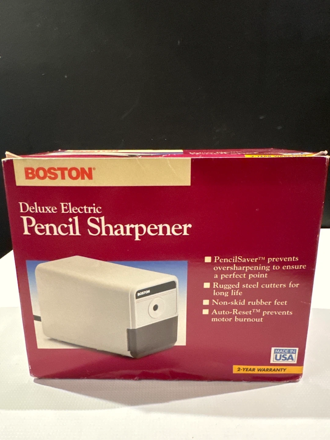 55Selling a Boston Deluxe Electric Pencil Sharpener! It comes with the box and has a 2-year warranty. The sharpener features PencilSaver technology to prevent oversharpening and rugged steel cutters for long life. It also has non-skid rubber feet and Auto-Reset to prevent motor burnout