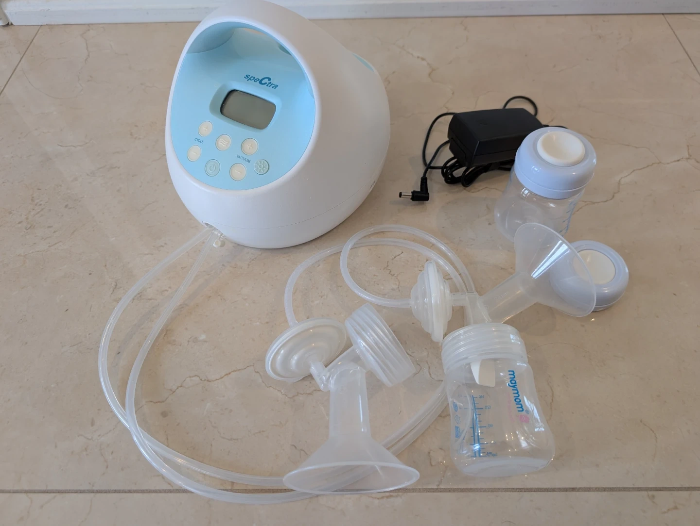 Gently used Spectra S1 Plus electric breast pump with dual pumping capabilities. It comes with all the visible accessories and power adapter. The pump offers adjustable cycle speed and massage/expression modes for personalized comfort.