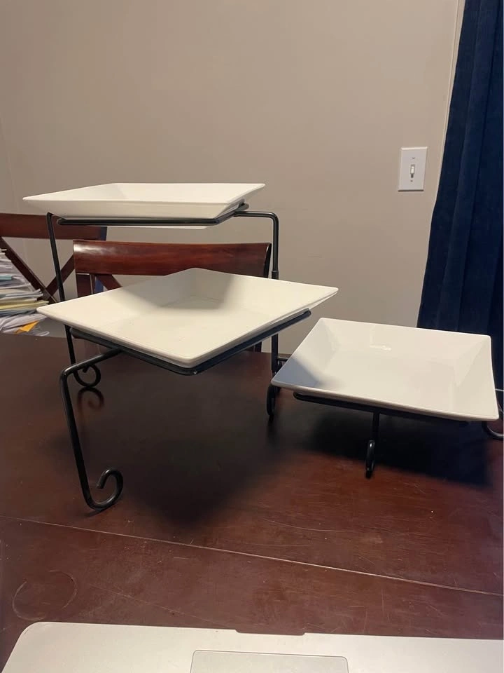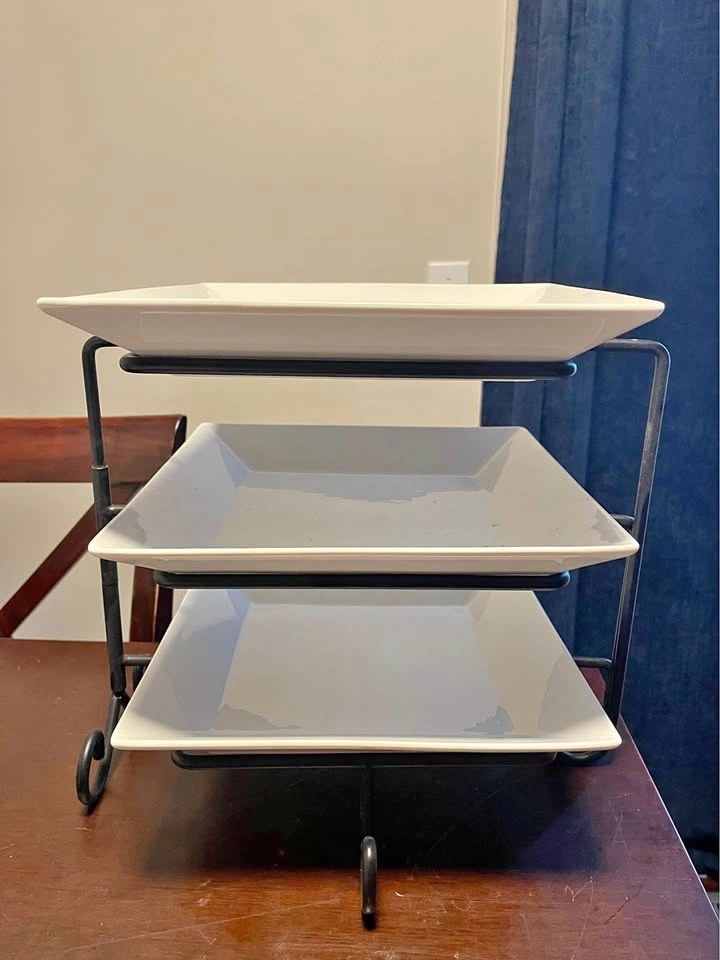 Perfect for home parties like baby showers, bake-offs, birthday parties, family-style dinners, or even your catering business. The black coated steel plate holder is great for presenting your delicious food. All plates are durable ceramic and microwave and dishwasher safe for easy cleaning.