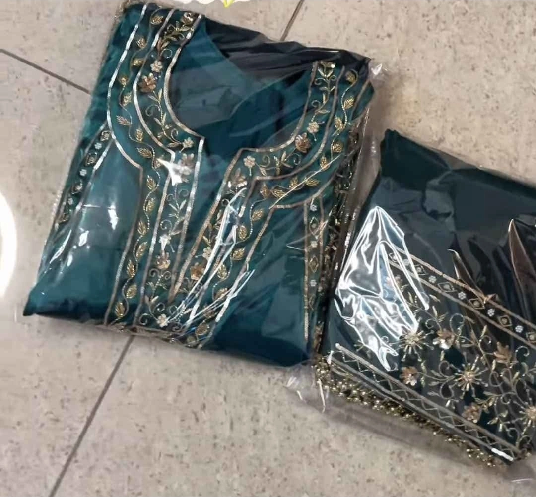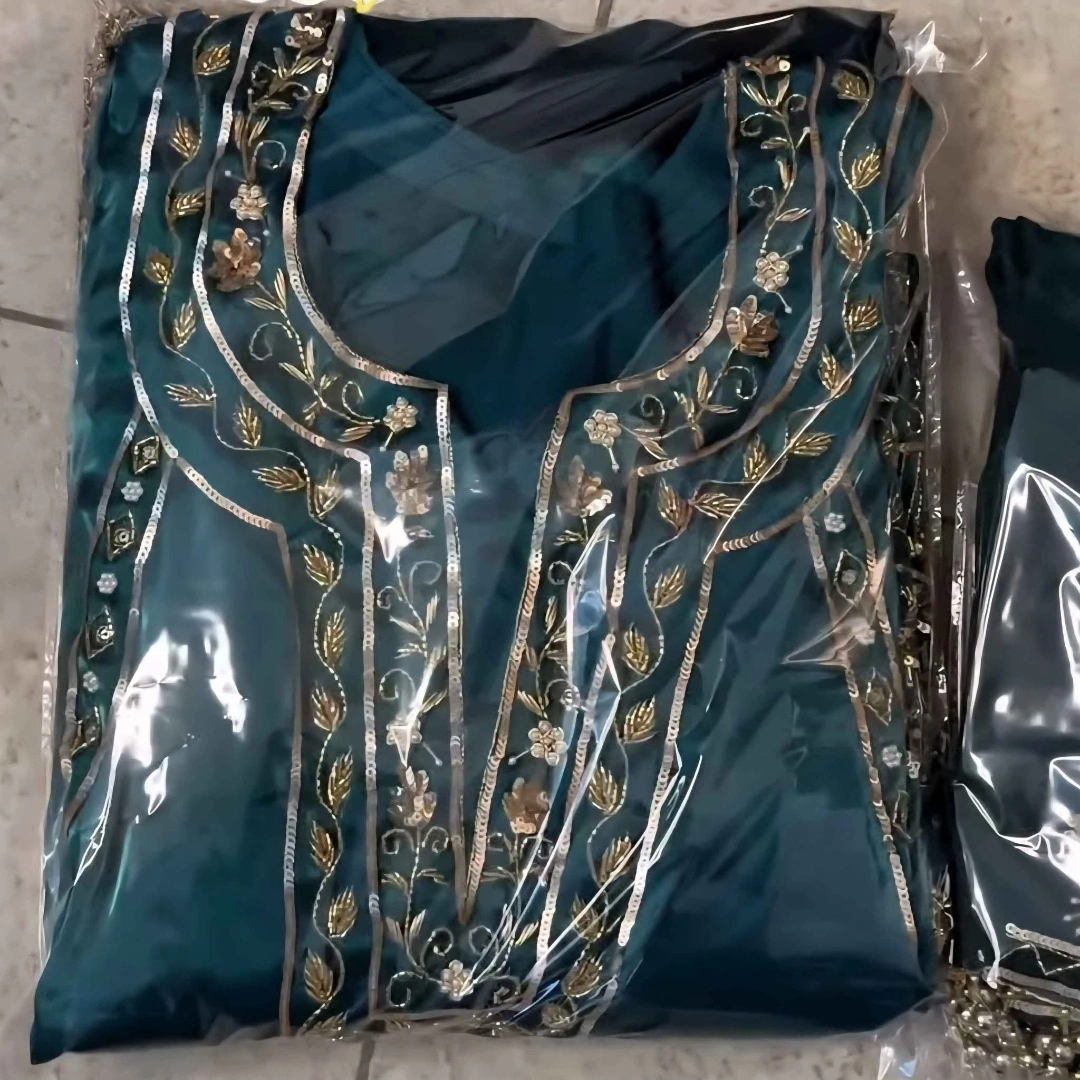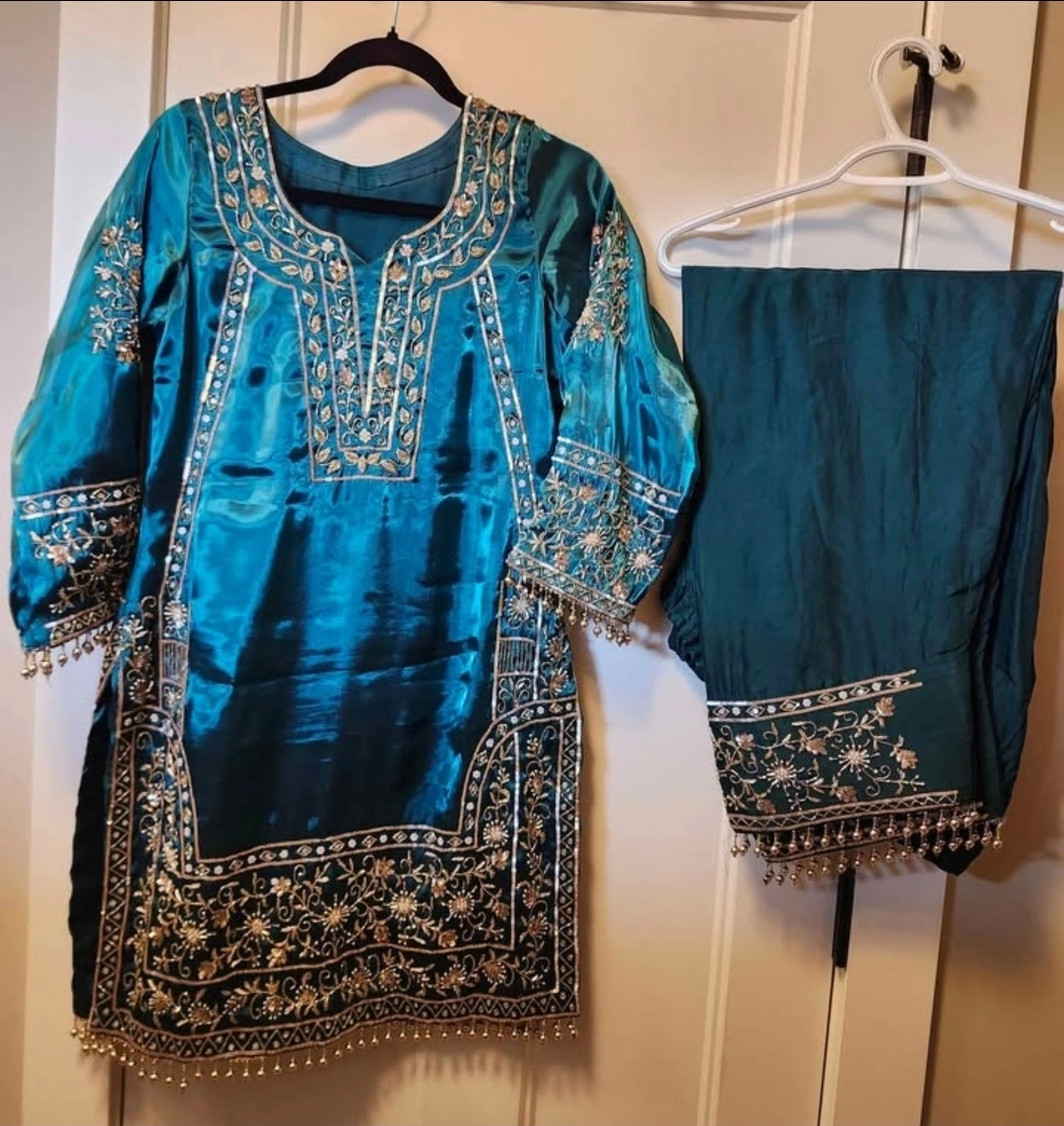 15Selling a pakistani style loose shirt and straight shalwar beautiful bottle green colour shalwar kameez with intricate gold embellishments. This outfit includes the kameez (tunic), shalwar (pants), and dupatta (scarf). Originally bought it for $285 CAD. Asking $180 OBO
