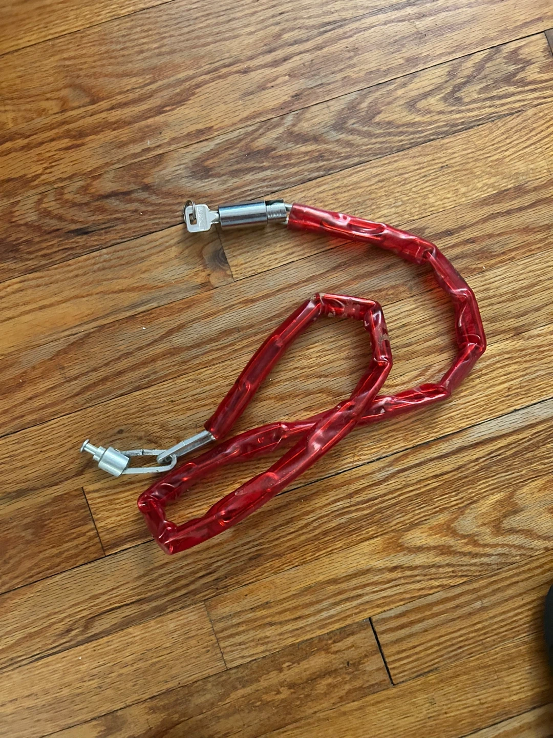 This is a red chain lock with a metal chain and red plastic coating. It includes one key. The lock mechanism is easy and completely functional. This lock is suitable for securing bicycles or other items.